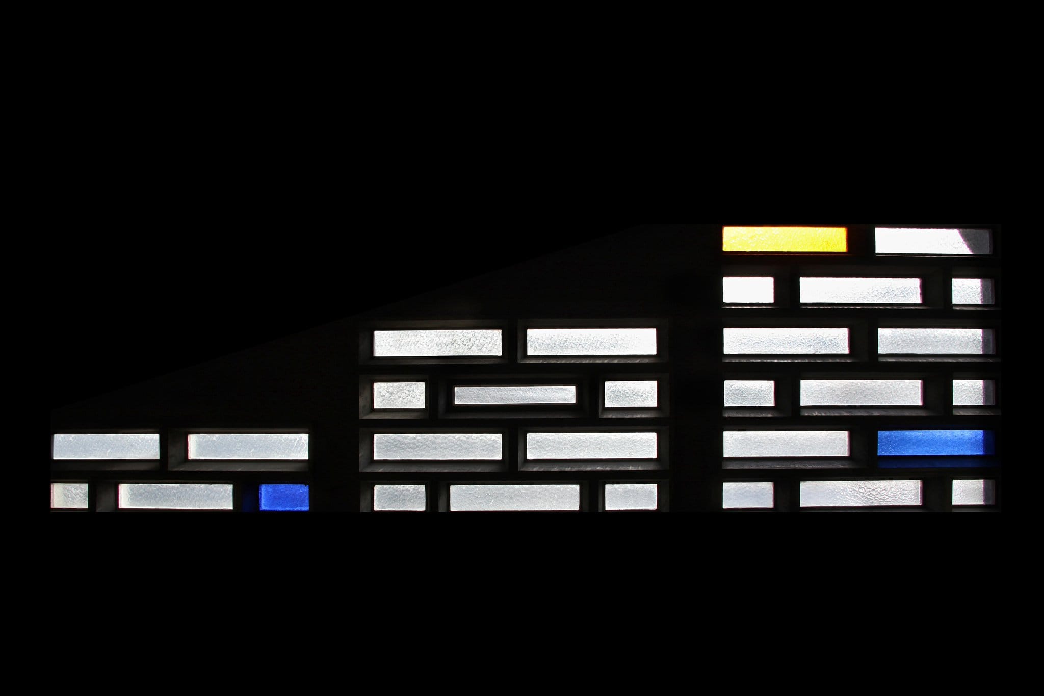 Paroi de verre de trois panneaux décroissants dans la hauteur, composés de claustras en béton à l’intérieur desquels il y a des verres doubles blancs, bleue et jaunes.