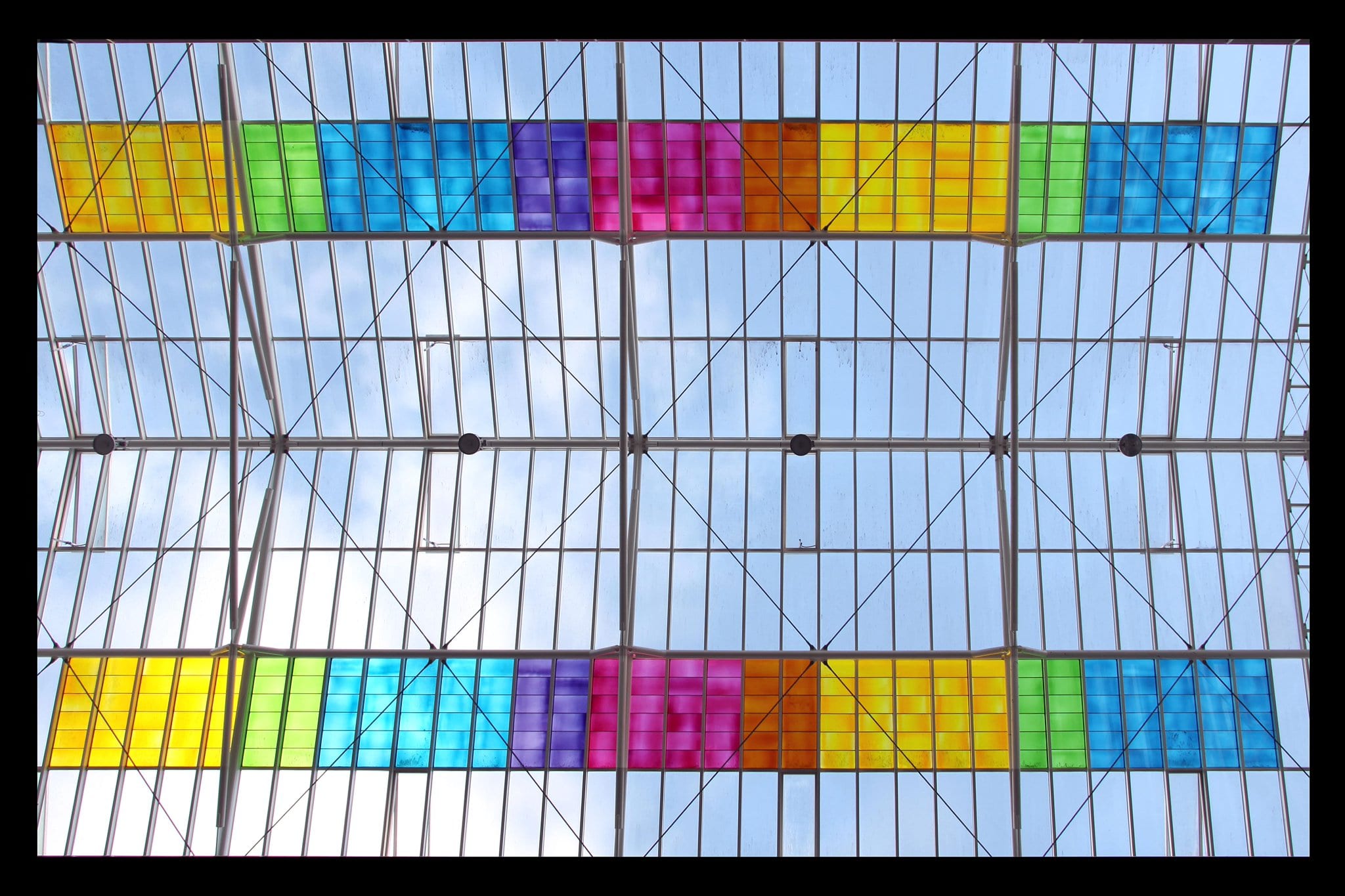 Des panneaux bleus, verts, jaunes, oranges et violets composent deux bandes colorées se déployant sur les deux pans de la verrière latérale.
