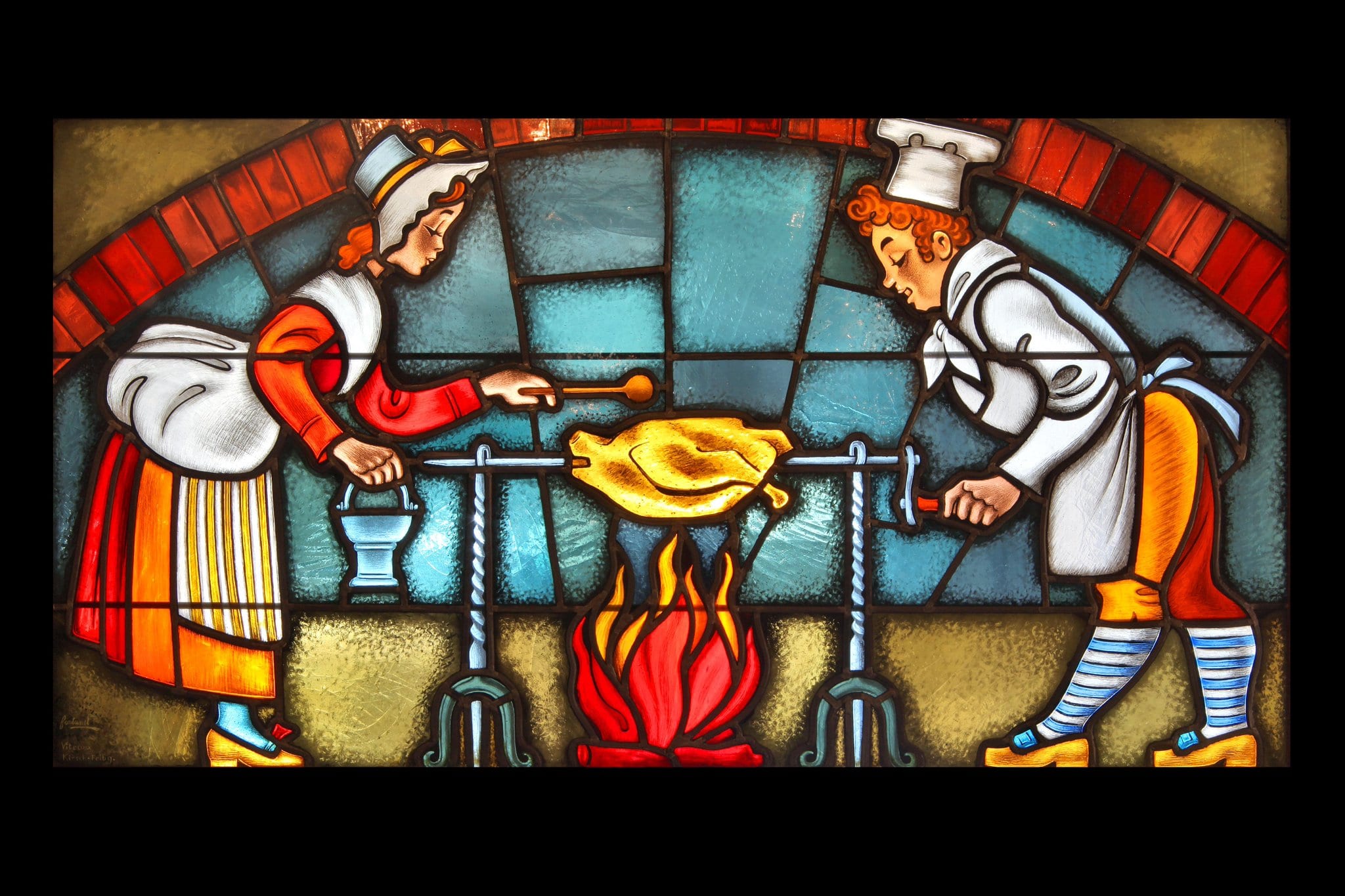Une femme, portant une coiffe, arrose avec une cuillère en bois une grosse dinde cuite sur le feu de bois alors qu’un cuisinier tourne la broche.