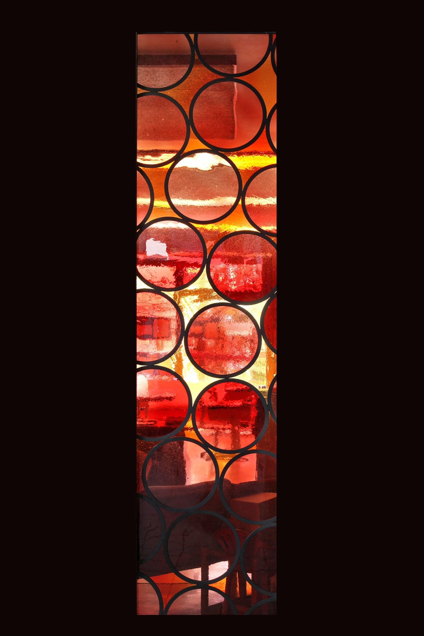 Un panneau décoratif composé de ronds rouges et roses sur fond jaune et orange.