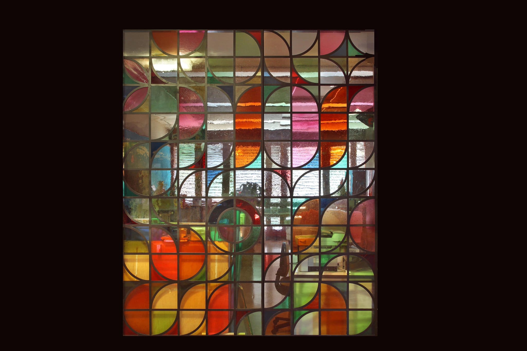 Un panneau décoratif composé de motifs géométriques oranges, verts, roses, rouges, bleus et blancs.
