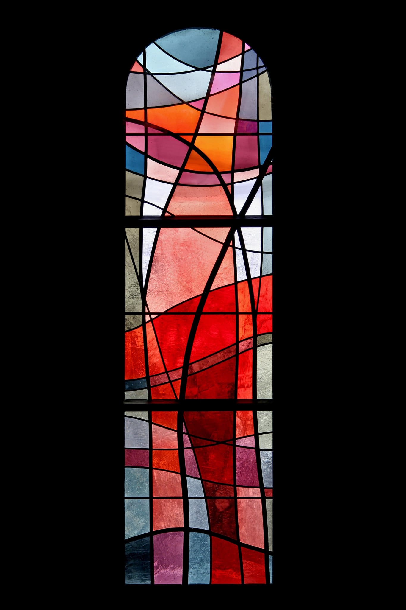 Vitrail non figuratif où les plombs d’épaisseurs différentes apportent une animation rythmique alors que les verres rouges dominent la composition accompagnés de verres gris, bleus, blancs et bruns.