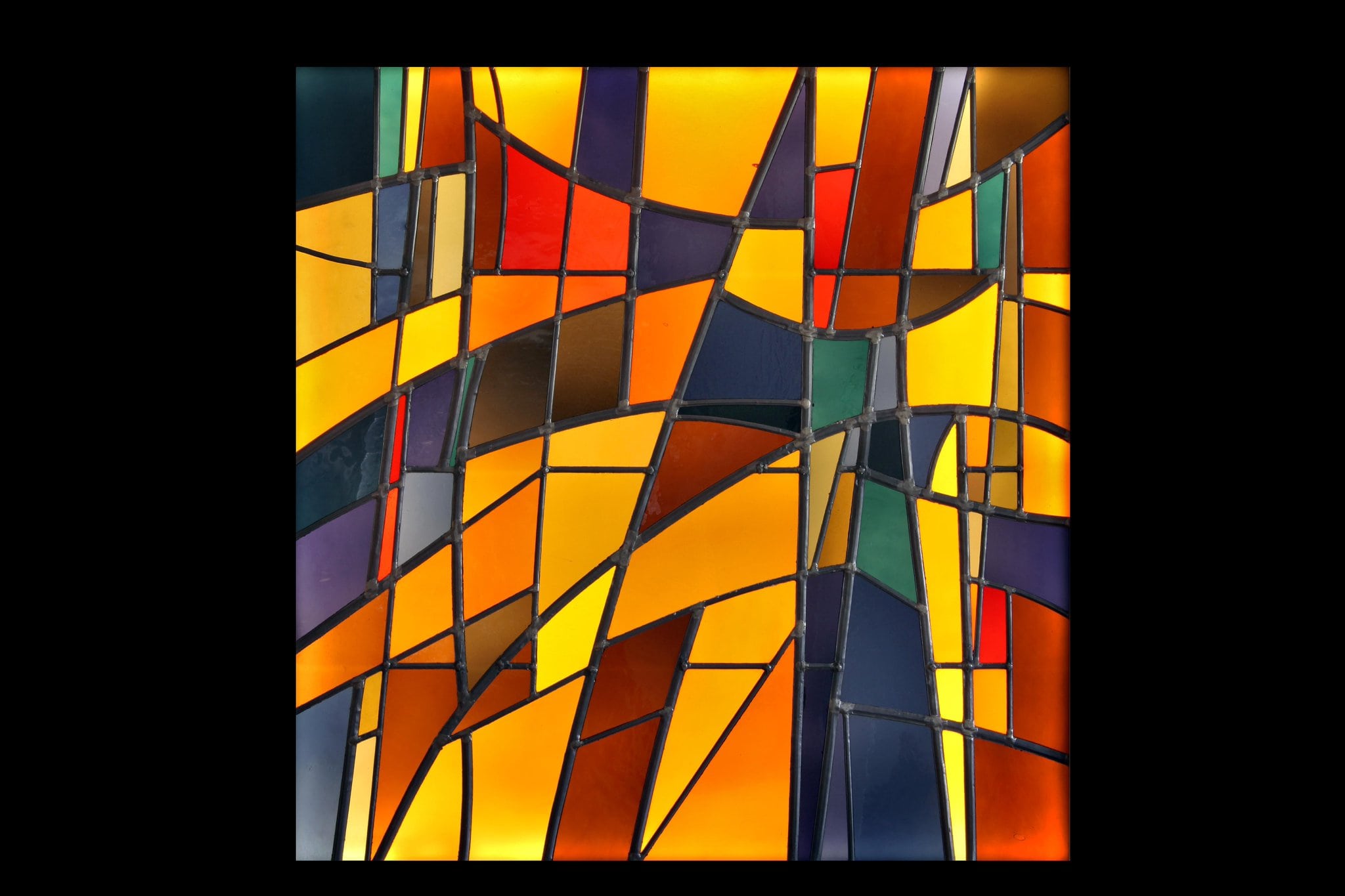 Vitrail non figuratif composé de teintes chaudes avec quelques verres bleus, gris et verts. Le réseau de plomb dessine des lignes verticales ascendantes coupées de courbes descendantes. Le tout suggérant la force, la quiétude et la certitude.