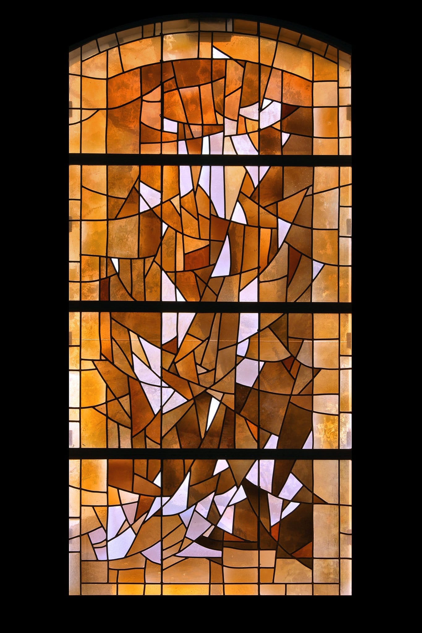 Vitrail non figuratif composé au centre de pièces de verre brunes, et blanches en alternance. Le tout entouré d’une bordure beige.