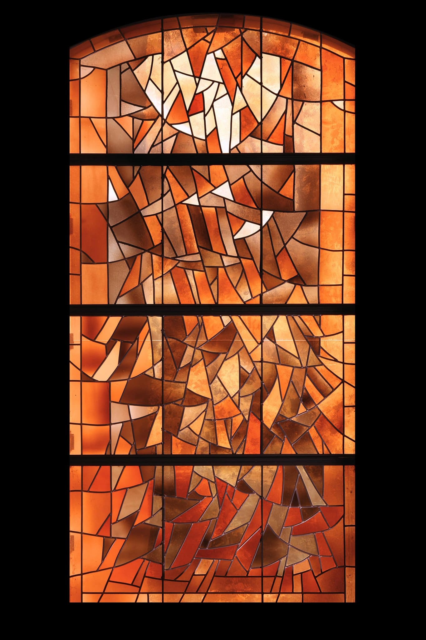Vitrail non figuratif composé au centre de pièces de verre brunes et oranges dans un mouvement ascendant avec des verres blancs au sommet. Le tout entouré d’une bordure brune.