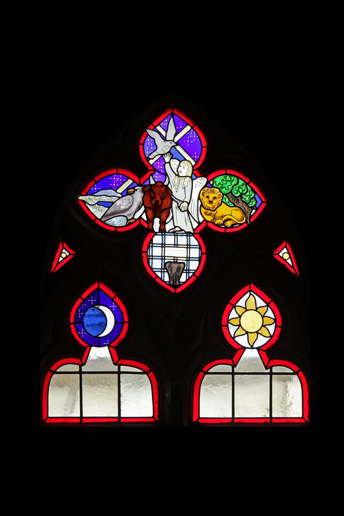 Au centre du quadrilobe l’aigle, le taureau, l’ange levant un bras vers une colombe et le lion couché sous un arbre. En dessous de l’inscription un éléphant. En-dessous du quadrilobe, la lune et le soleil.