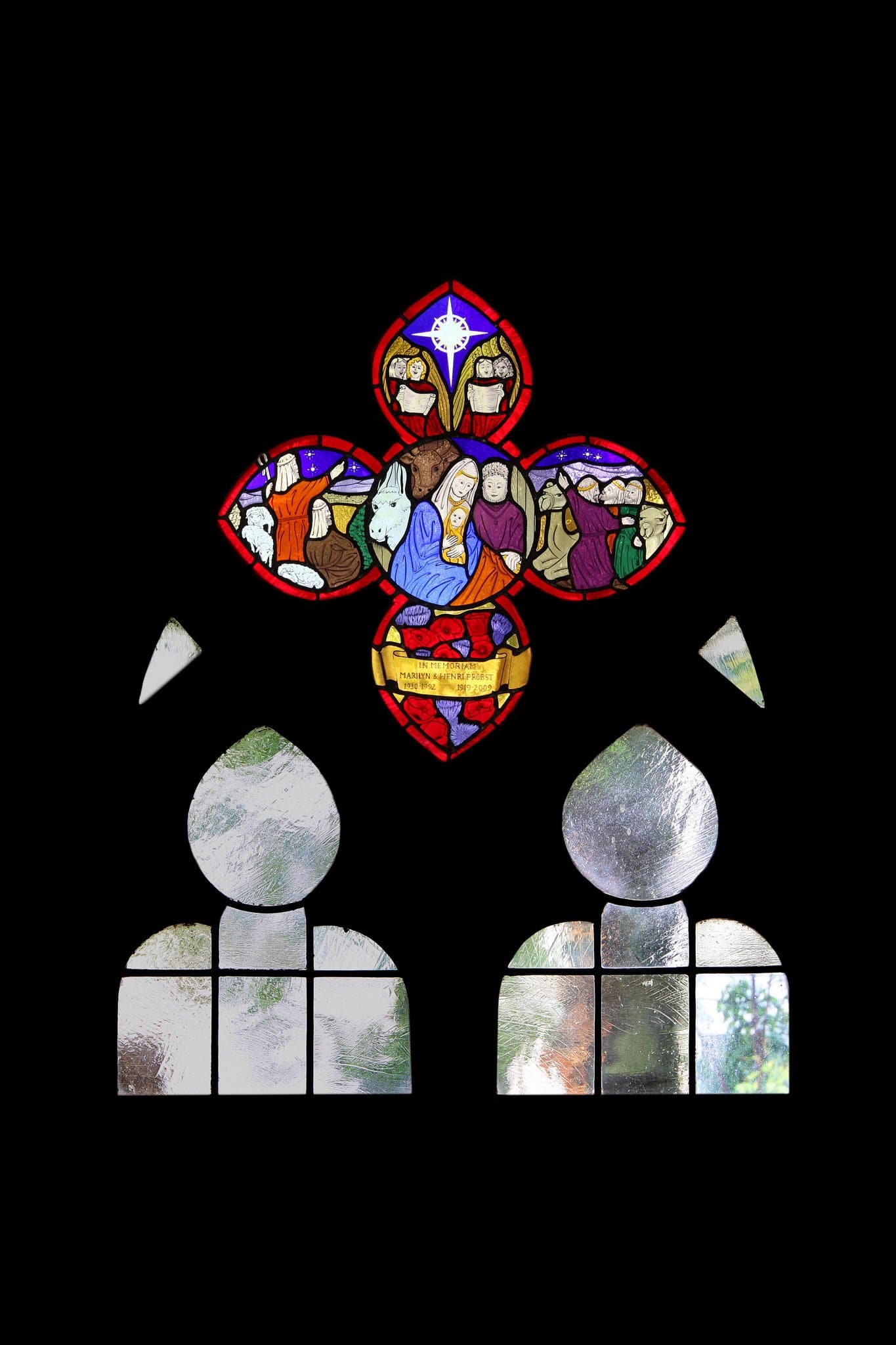 A gauche, deux bergers entourés de moutons montrent l’étoile de Bethléem brillant au-dessus d’anges chantant. A droite, les mages avec deux chameaux font de même. Au centre, Marie assise aux côtés de Joseph, tient l’Enfant Jésus dans ses bras. A leur droite, l’âne et le boeuf. En bas, des coquelicots et des chardons.