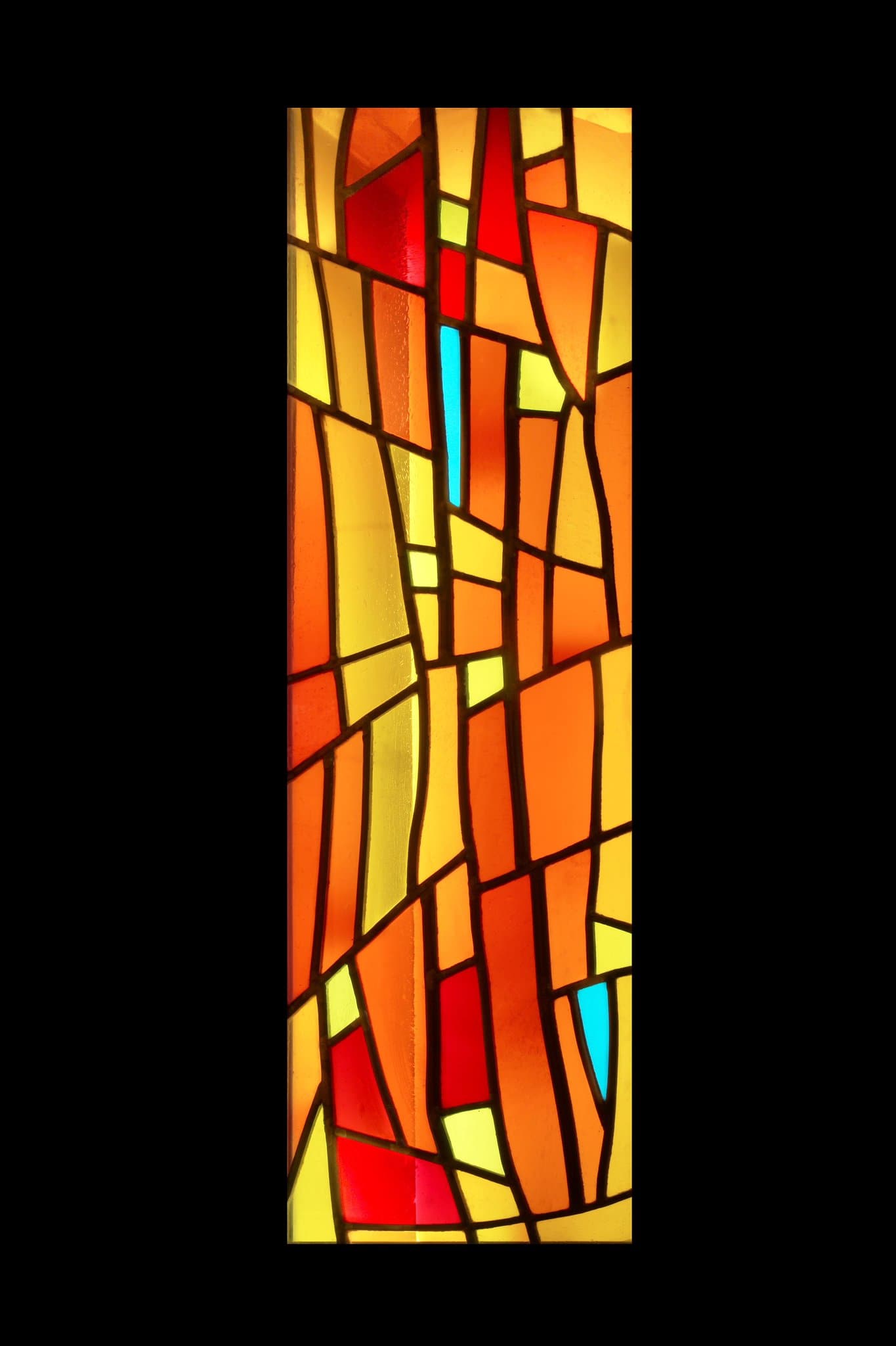 Vitrail non figuratif composé de tons chauds oranges, jaunes et rouges avec des touches de vert et de bleu.