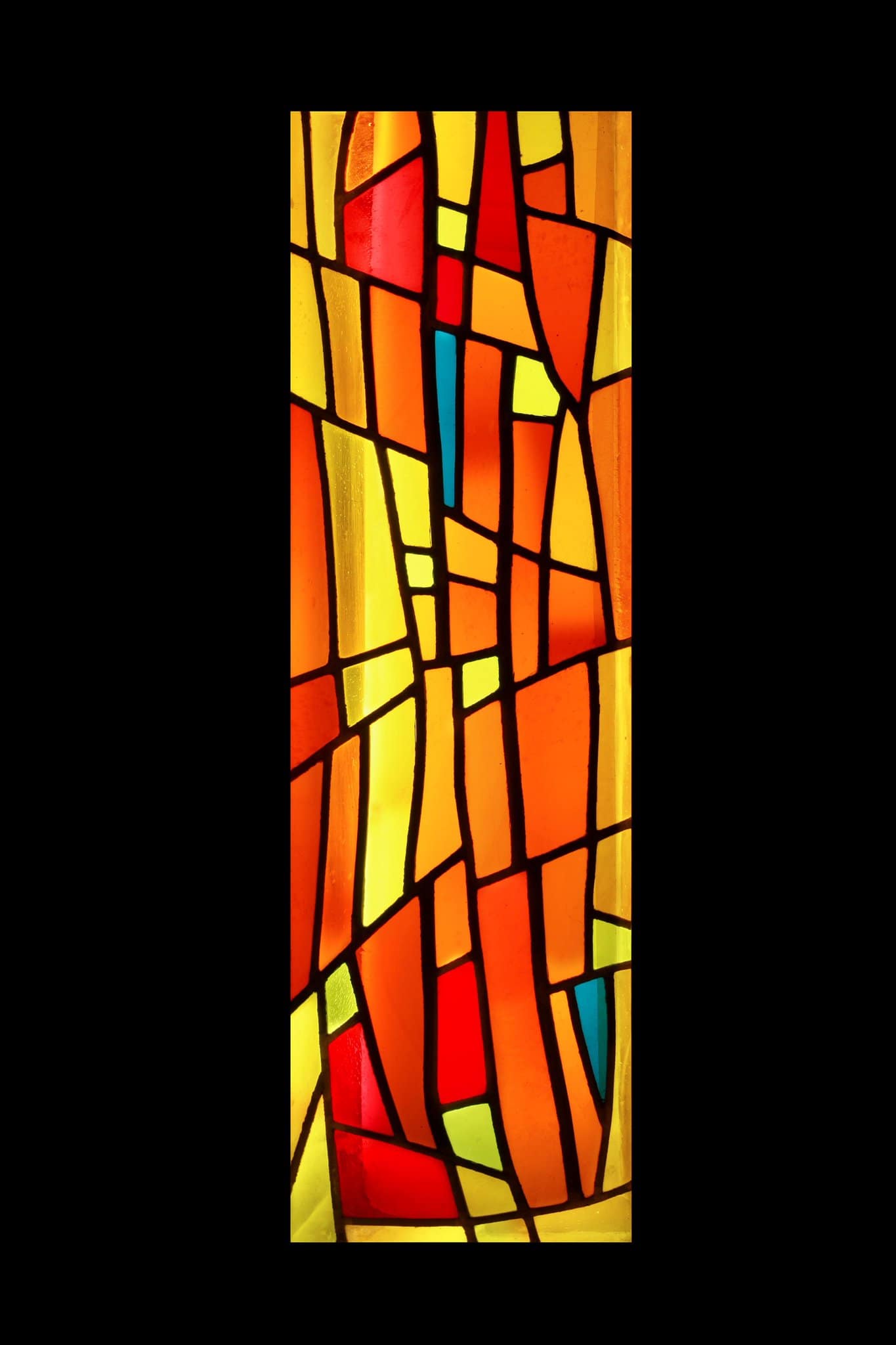 Vitrail non figuratif composé de tons chauds oranges, jaunes et rouges avec des touches de vert et de bleu.