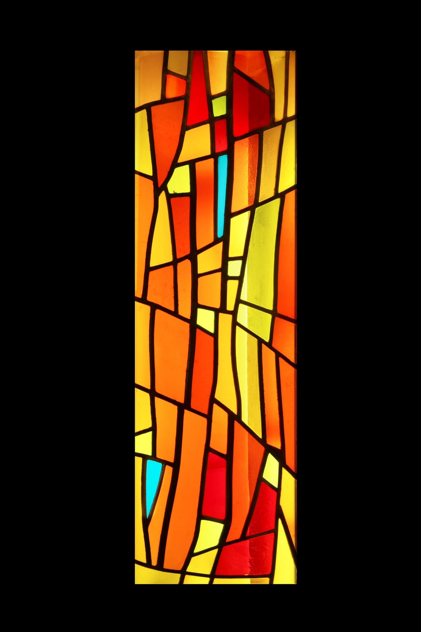 Vitrail non figuratif composé de tons chauds oranges, jaunes et rouges avec des touches de vert et de bleu.