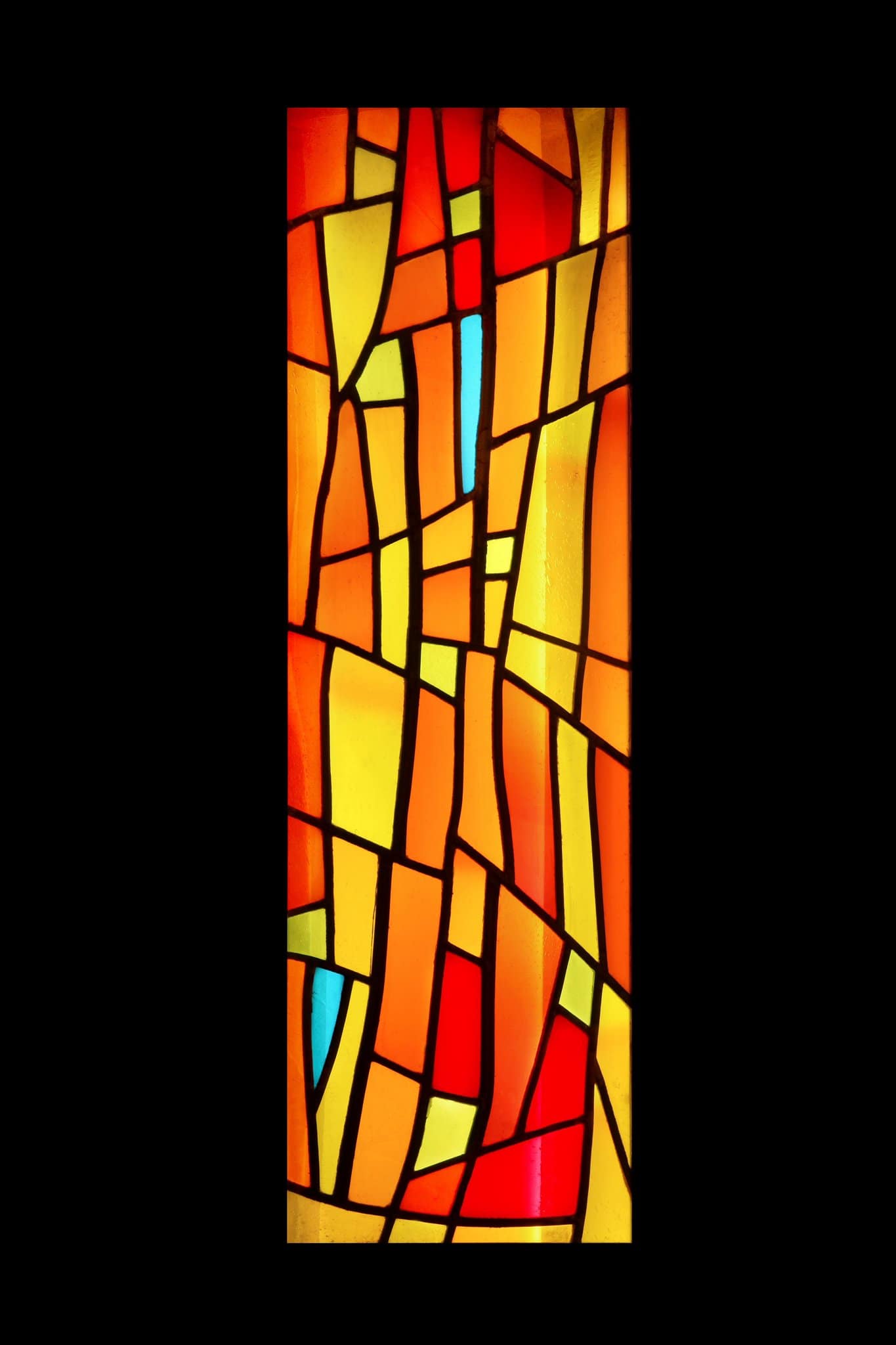 Vitrail non figuratif composé de tons chauds oranges, jaunes et rouges avec des touches de vert et de bleu.
