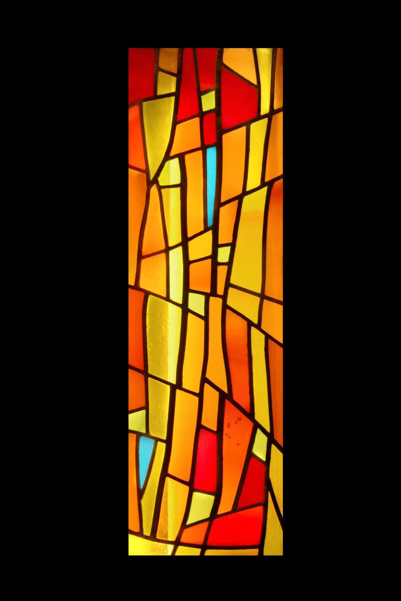 Vitrail non figuratif composé de tons chauds oranges, jaunes et rouges avec des touches de vert et de bleu.