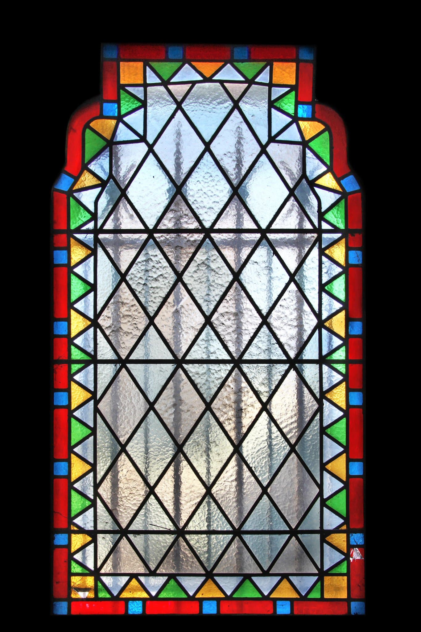 Vitrail à losanges encadrée d'une double bordure décorative colorée