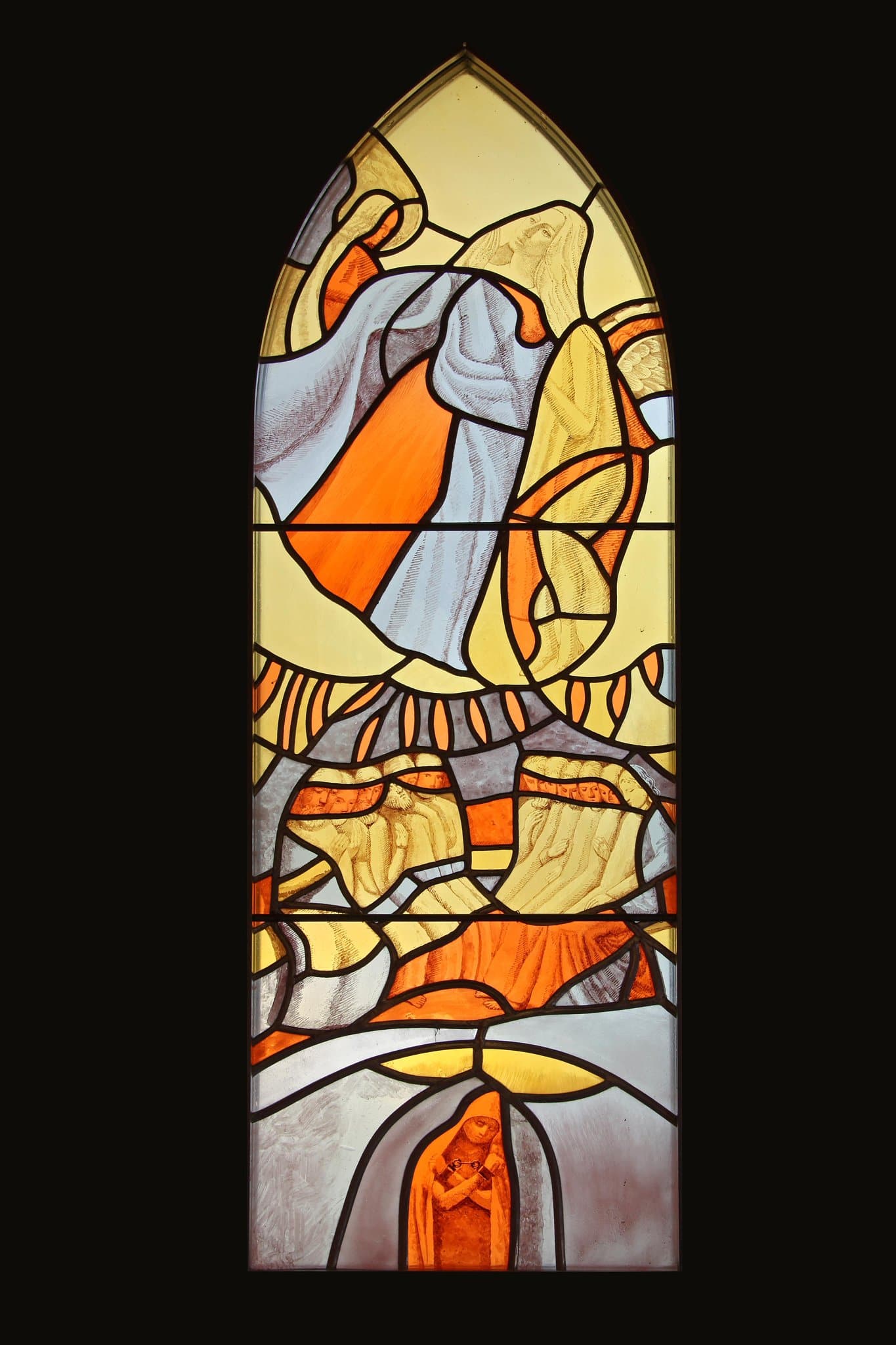 En bas, une femme, les poignets menottés, baisse la tête. Au centre, les apôtres reçoivent l’Esprit Saint sous la forme de langues de feu. En haut, une femme, les mains jointes, est entourée de deux anges.
