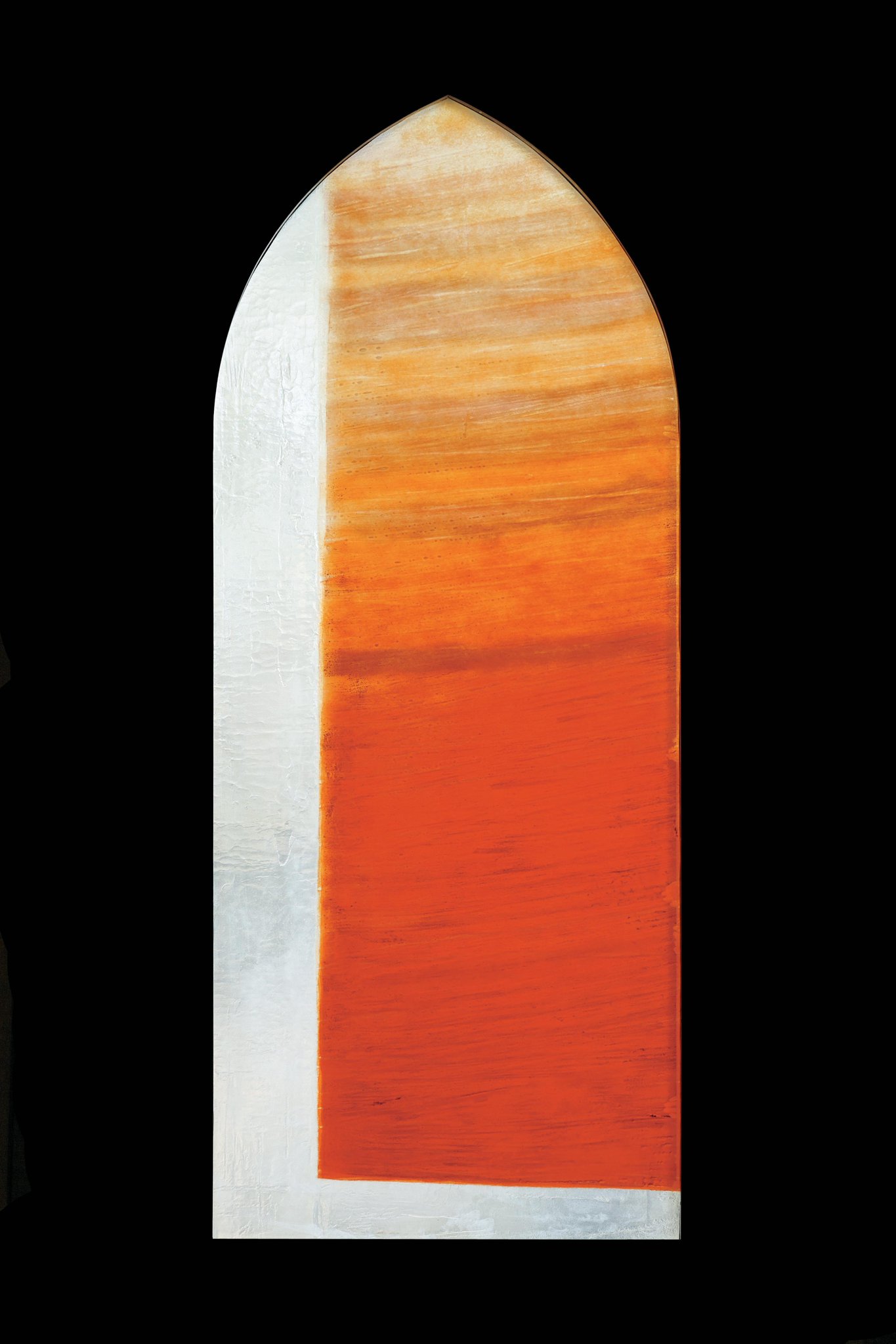 Vitrail non figuratif composé d’une grande partie rouge orangée ouverte sur une partie gauche blanche qui se prolonge à la base de la fenêtre.