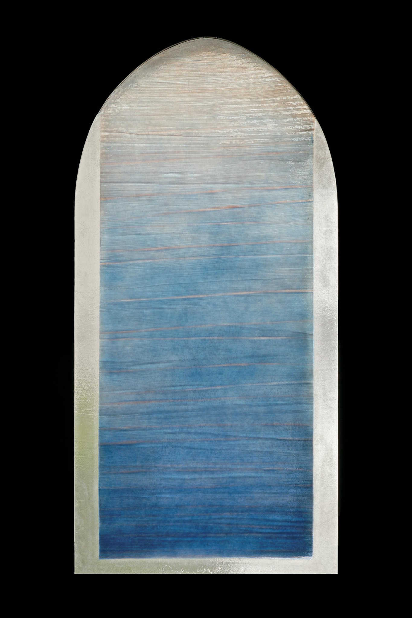 Vitrail non figuratif composé de teintes bleues azur, bleues ciel et grises et striées de lignes horizontales alors qu’une bande blanche se déploie sur les côtés et le bas de la fenêtre. Dans la partie inférieure droite apparaît une touche de rouge orangée.