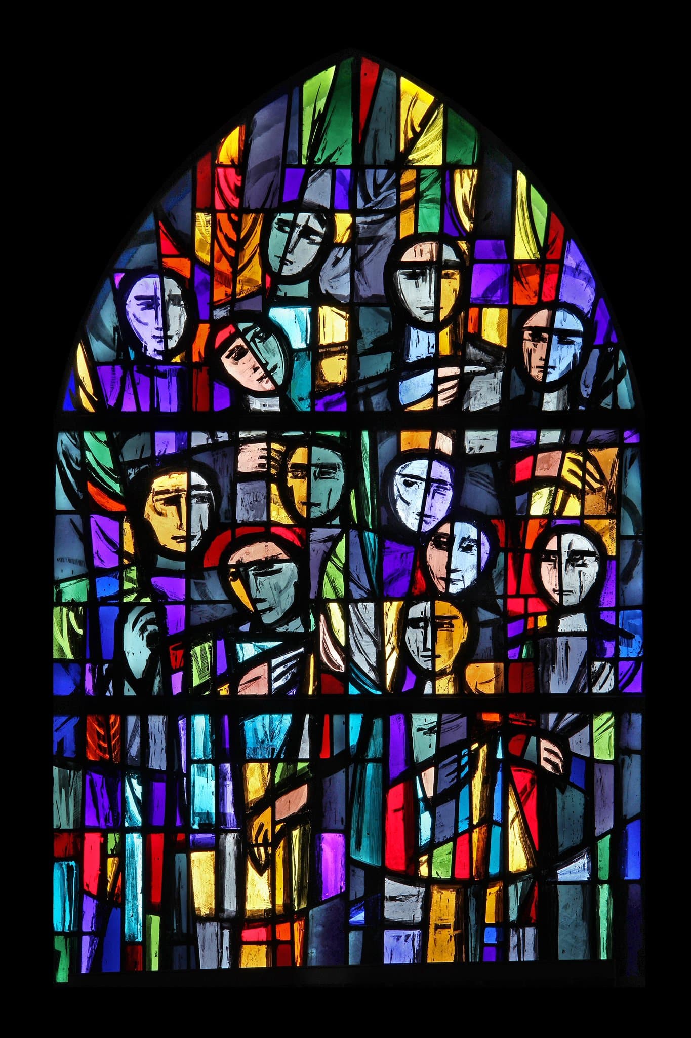 Douze personnages figurant les élus, agitent des palmes devant le trône de Dieu ; leurs visages blancs reflétant un état de grâce.