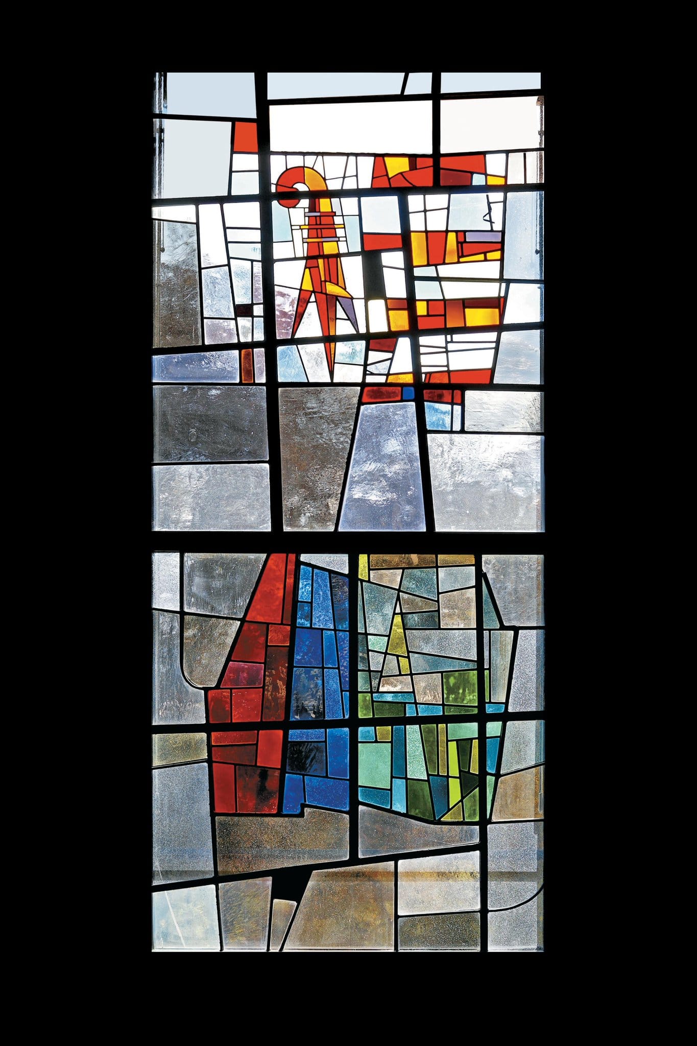 En haut, les armoiries du Jura, en bas celles du Tessin et de Vaud insérées côte à côte au centre de la fenêtre composée de verres clairs.