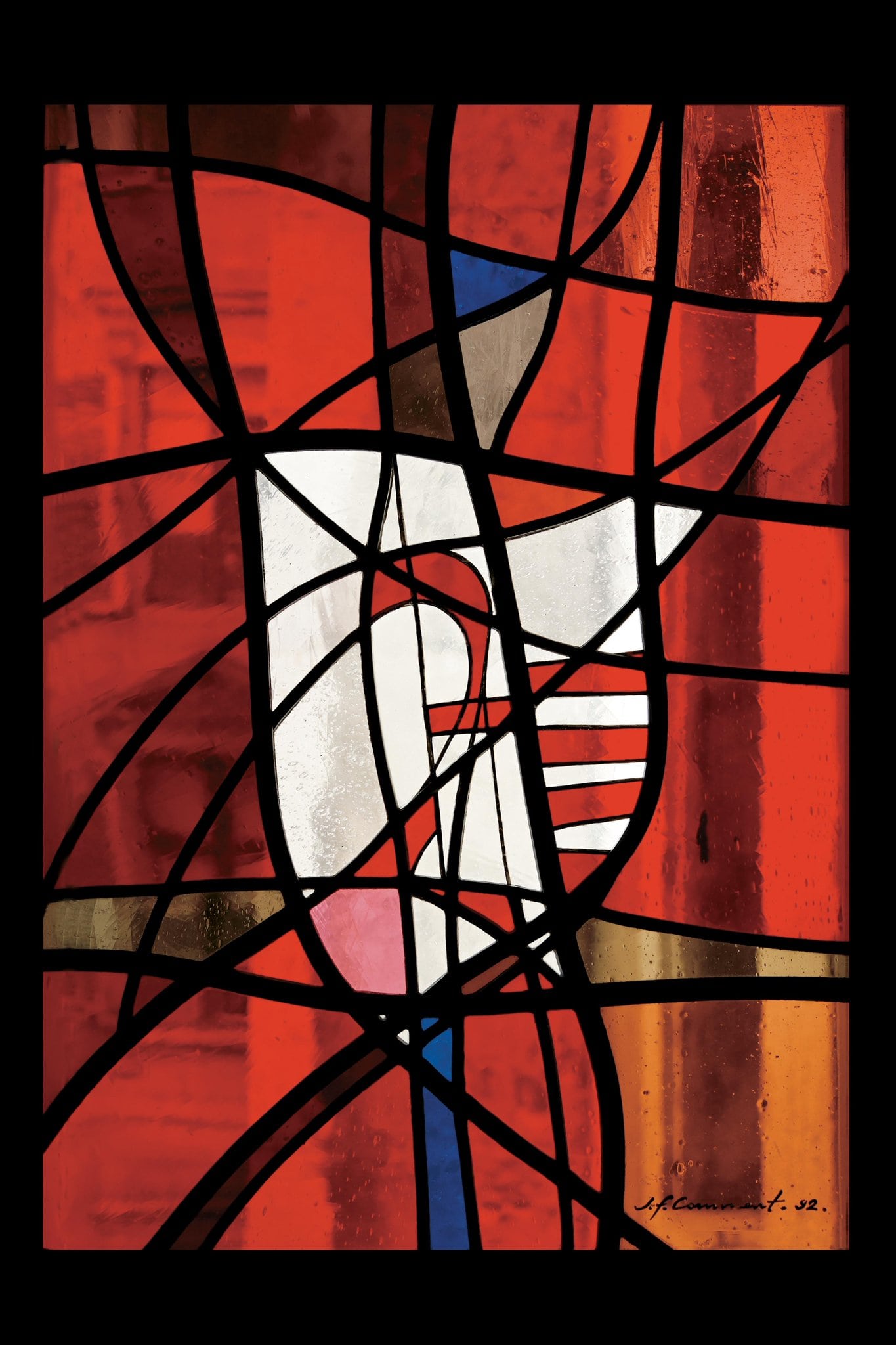 Les armoiries du Jura placées au centre de la fenêtre composée de verres aux teintes rouges.