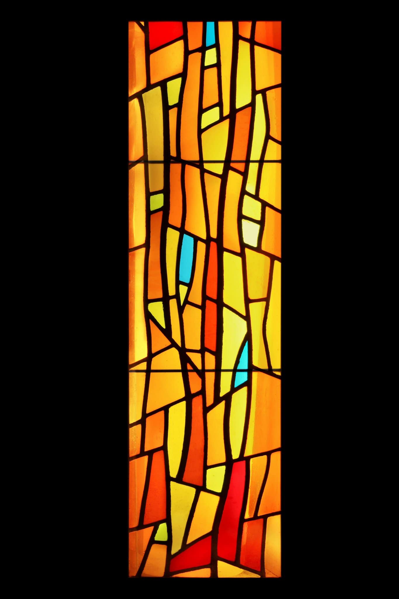 Vitrail non figuratif composé de tons chauds oranges, jaunes et rouges avec des touches de vert et de bleu.