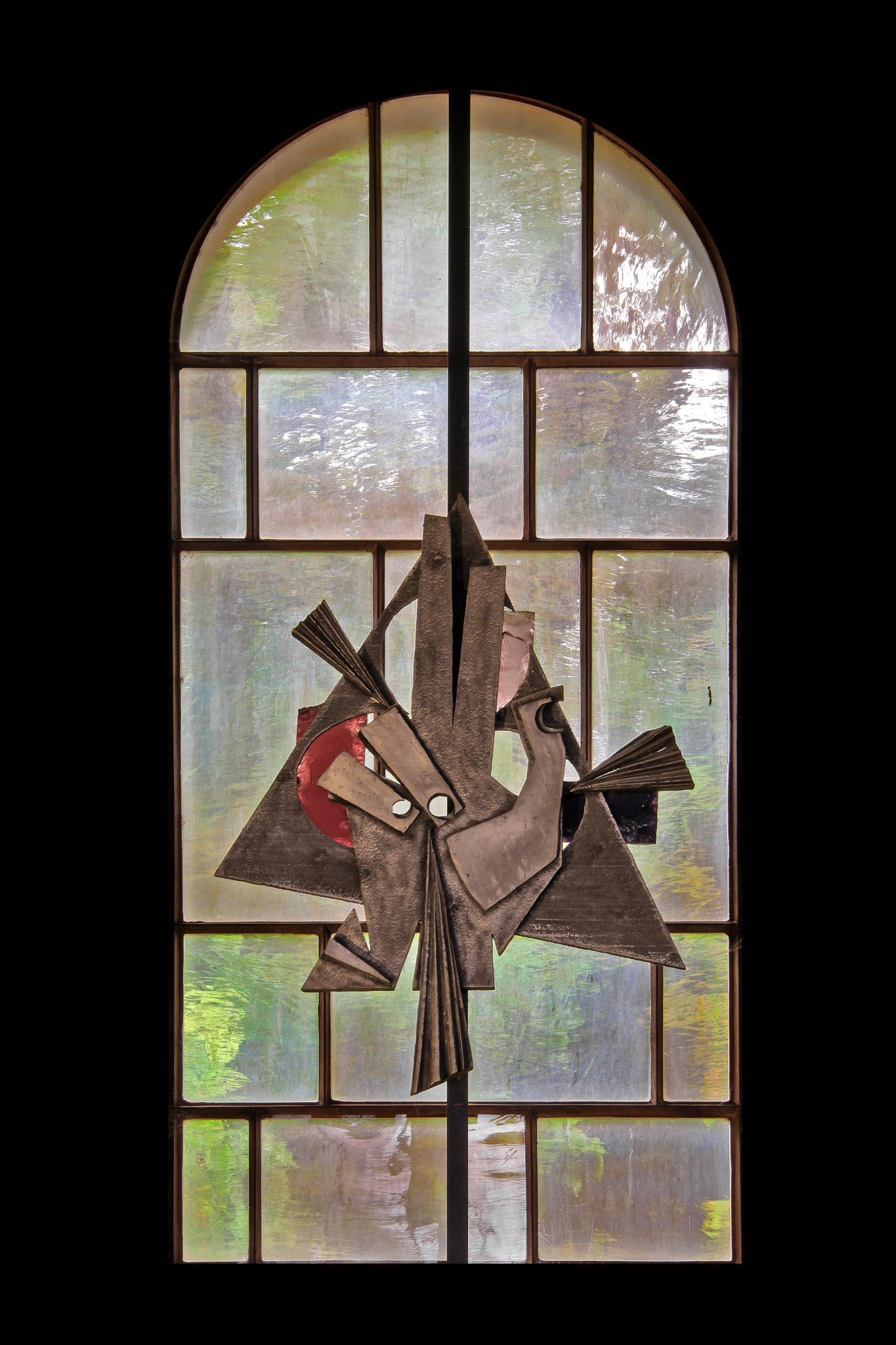 Devant, un décor sculpté avec un triangle et une main symbolisant la puissance créatrice de Dieu avec des incrustations de dalle de verre rose et noire montées sur une barre métallique. Derrière, une fenêtre de verre blanc mis en plomb.