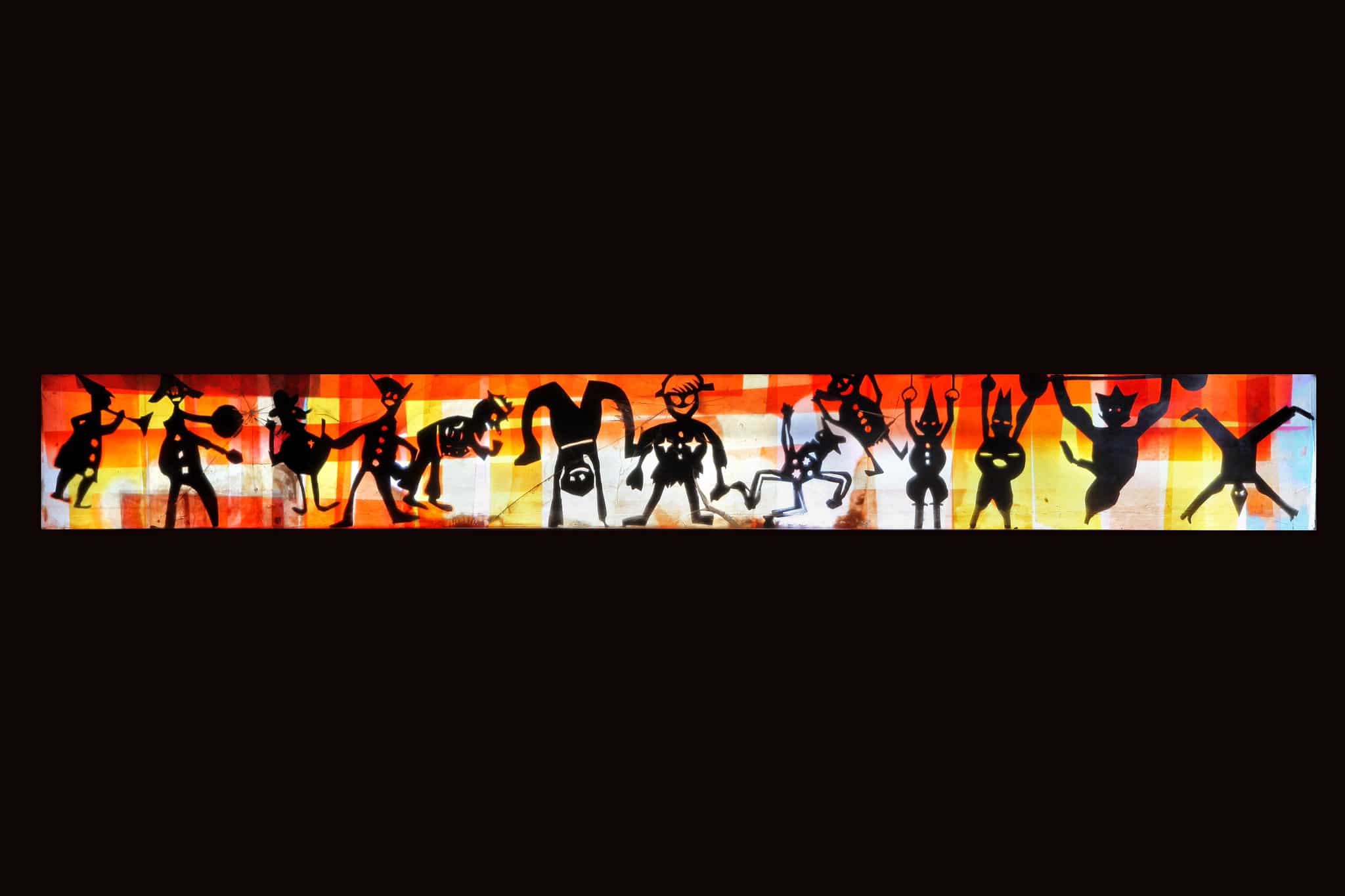 Treize clowns jouent de la musique ou font de l’acrobatie sur un fond orange et jaune.