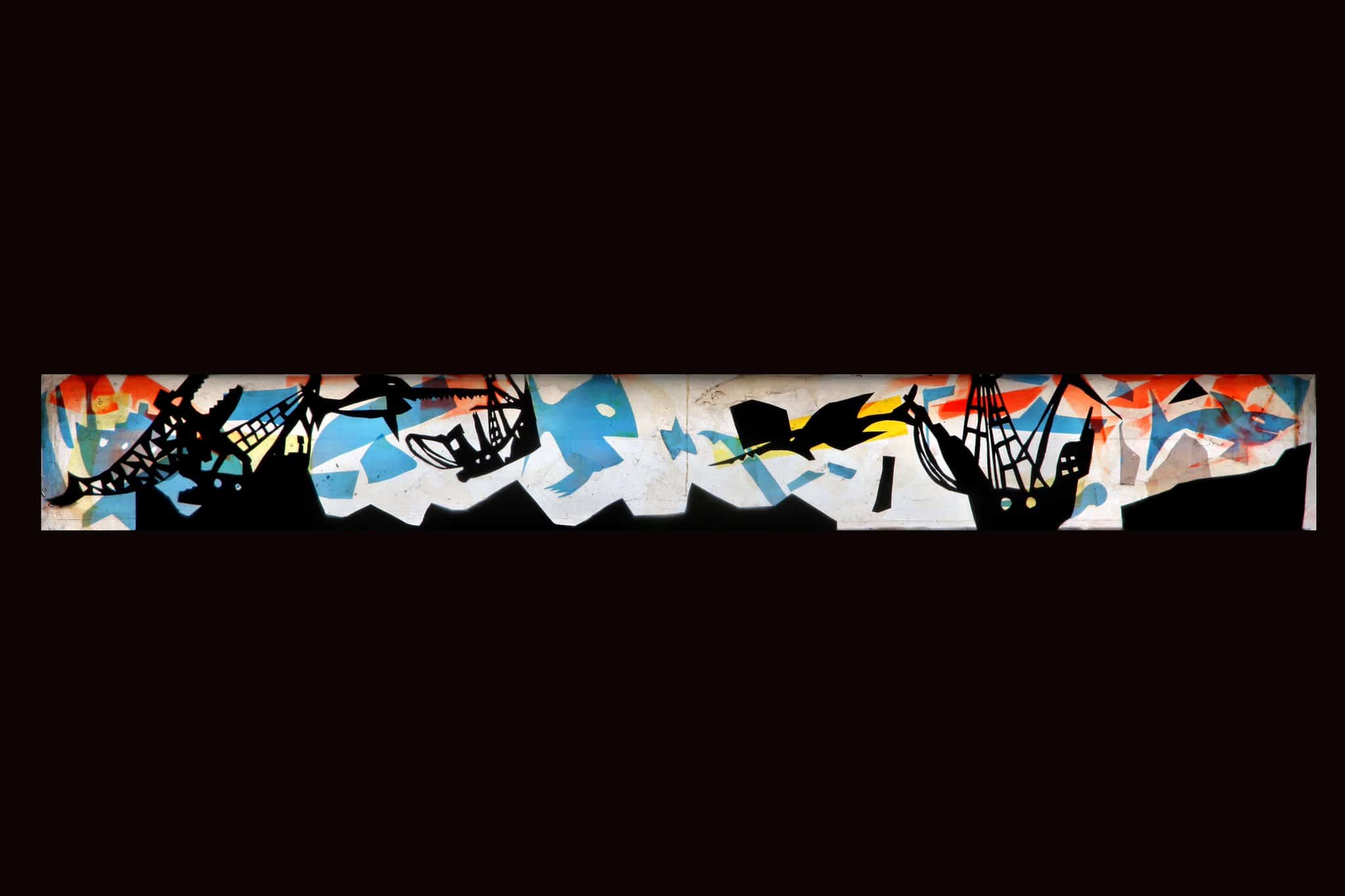 Trois navires voguent sur les flots entourés d’icebergs alors que deux poissons-scies et un requin nagent autour d’eux. Le tout sur un fond bleu et blanc avec quelques touches de jaune et d’orange.