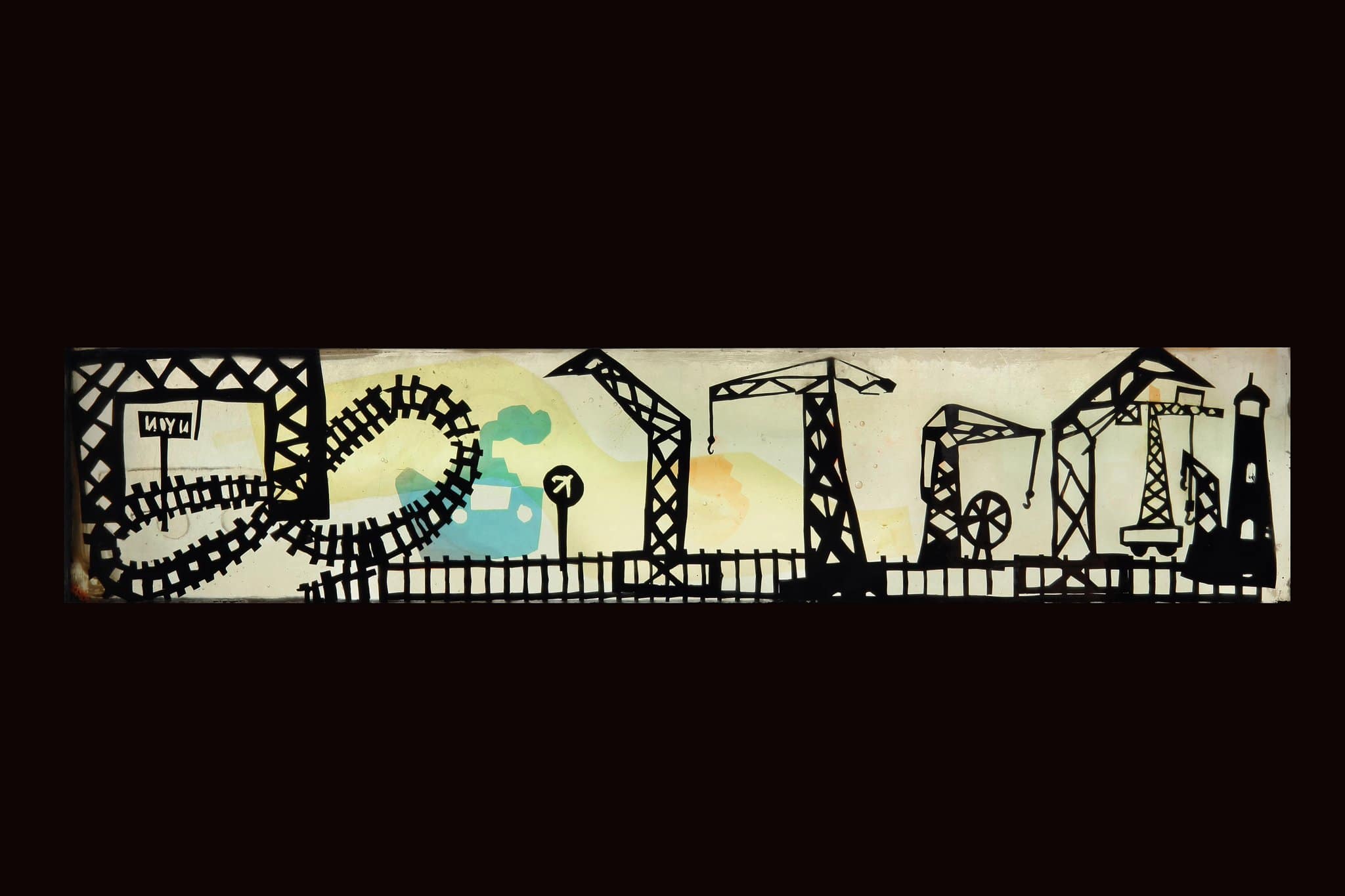 Cinq grues et un phare sont placés derrière une barrière, alors que des rails forment un huit sous un porche métallique. Dans le fond un bateau à vapeur. Le tout sur fond jaune et blanc.