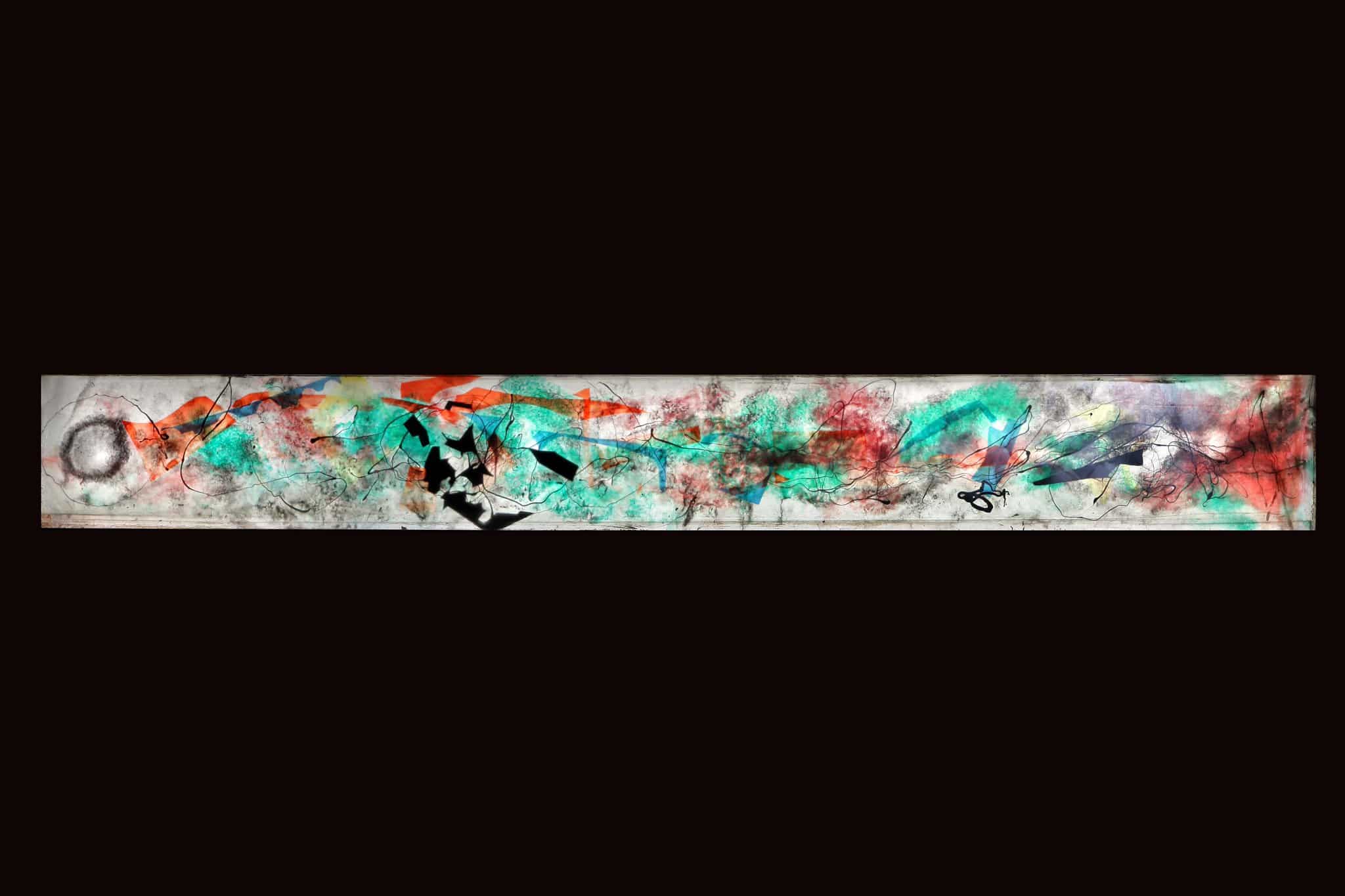 Un dessin de lignes noires sur un décor vert, orange, bleu, jaune et rouge sur fond blanc.