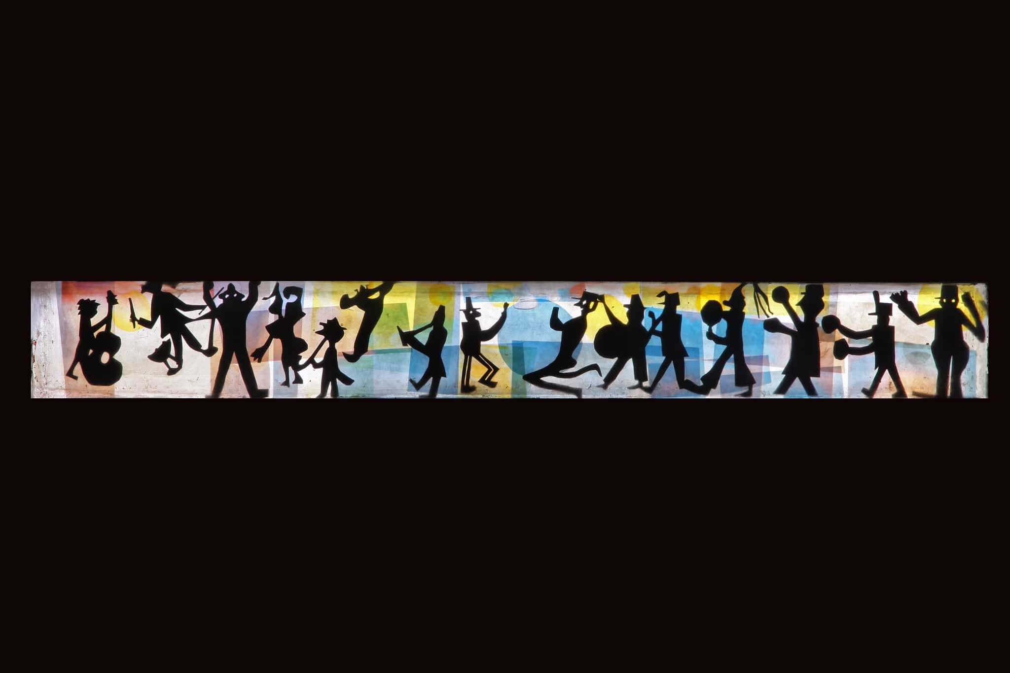 Une fanfare de quinze musiciens jouent sur une place. Le tout sur fond bleu, orange, jaune et blanc.
