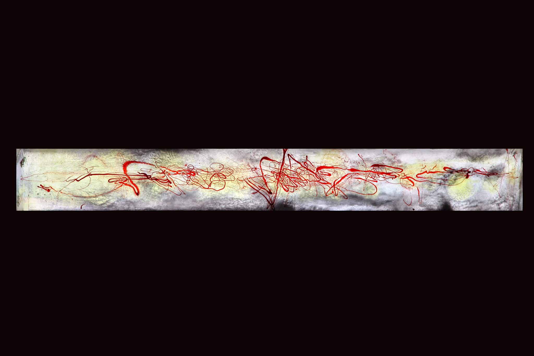 Un dessin de lignes rouges sur un fond blanc, jaune et noir.