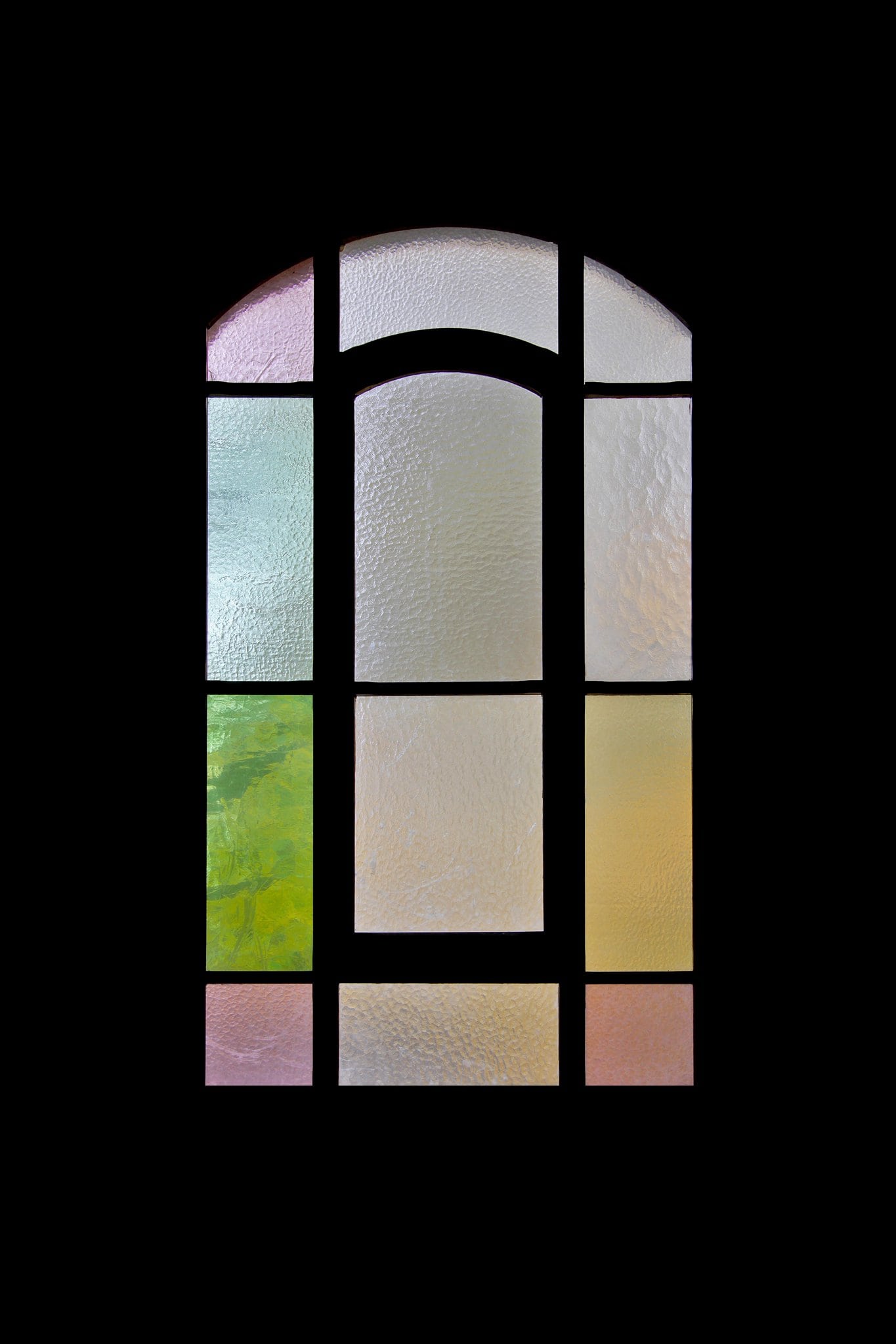 Vitrail composé de verre cathédrale avec une bordure jaune, verte et rose.