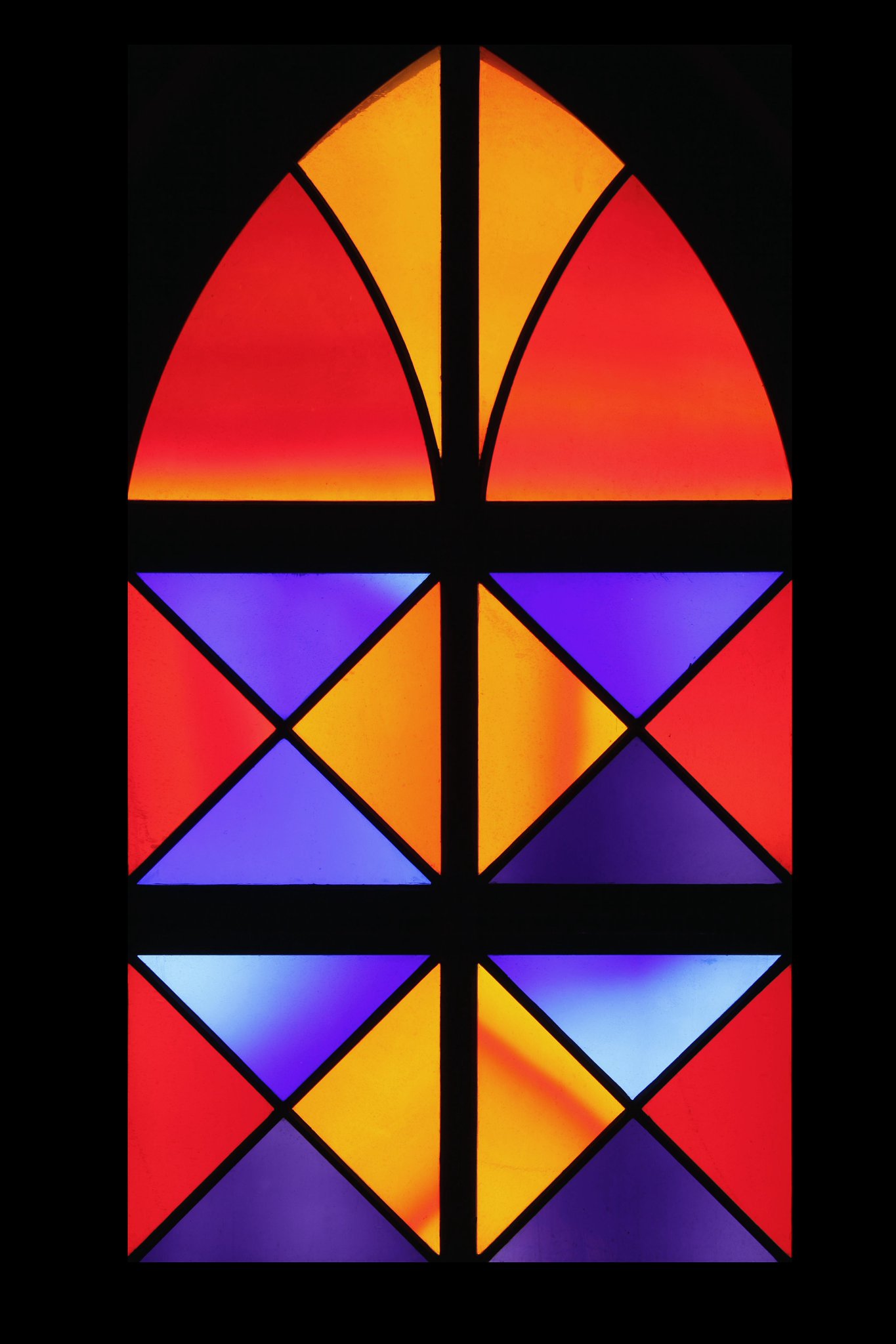 Vitrail géométrique composé de deux lancettes avec des verres bleus, oranges et rouges.