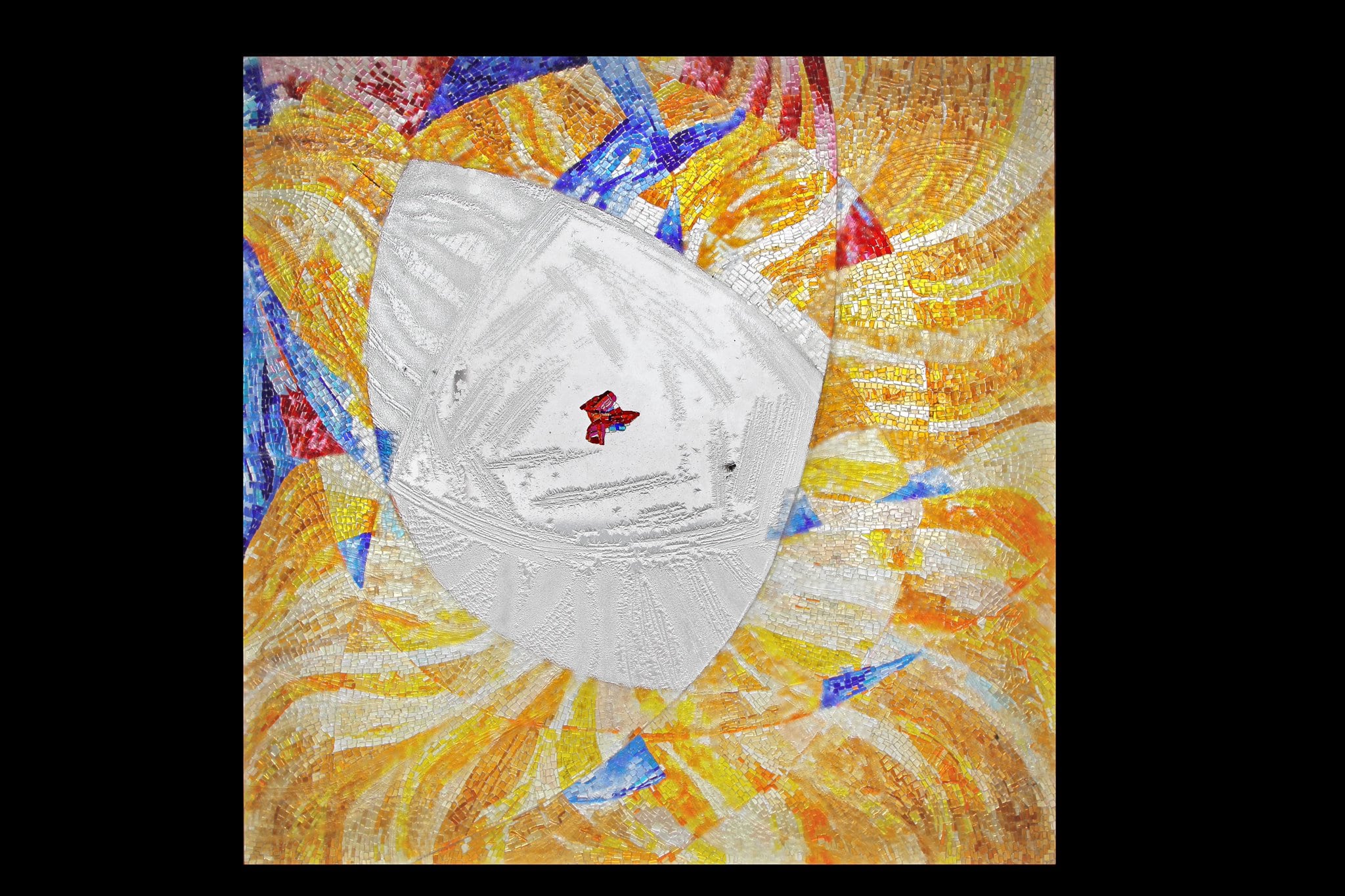 Au centre, une pièce en verre blanc gravé. Autour, de la mosaïque dans les teintes blanches, jaunes, rouges et bleues.