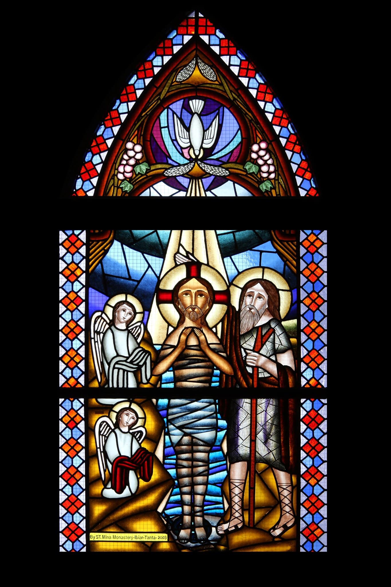 Le Christ, debout dans les eaux du Jourdain, est baptisé par Jean, alors que la colombe du Saint-Esprit descend sur lui. A gauche, deux anges agenouillés tiennent ses vêtements. Une large bordure géométrique bleue et rouge encadre le vitrail.