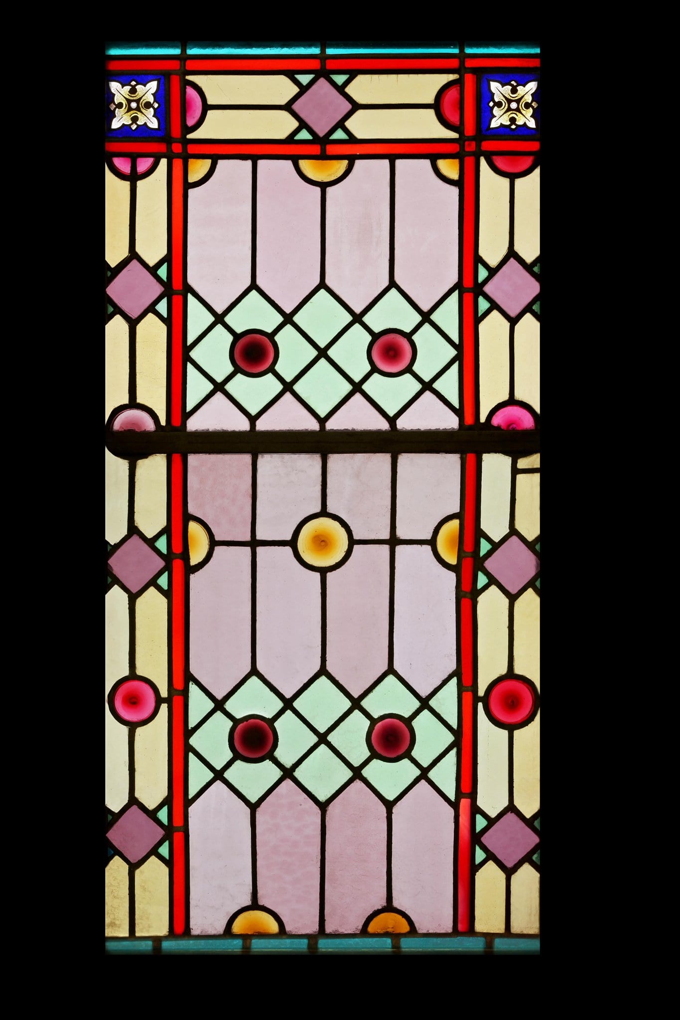 Vitrail géométrique composé de verres clairs et de culs de bouteille. Dans les angles supérieurs, deux carrés bleus avec des motifs végétaux peints à la grisaille.
