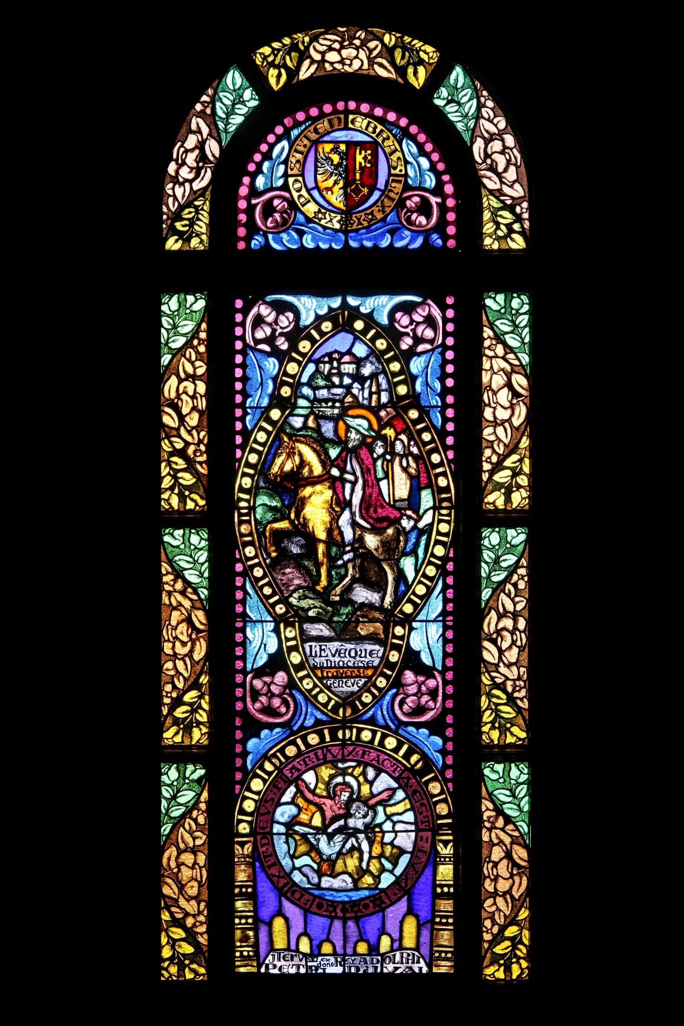En haut, les armoiries de Genève. Au centre, François de Sales traverse Genève sur son cheval à la rencontre des gens. Dans le fond, la cathédrale Saint-Pierre sans sa flèche. En bas dans un médaillon, Dieu, les bras ouverts offre la lumière, accompagné de l’enfant Jésus et du Saint-Esprit.
