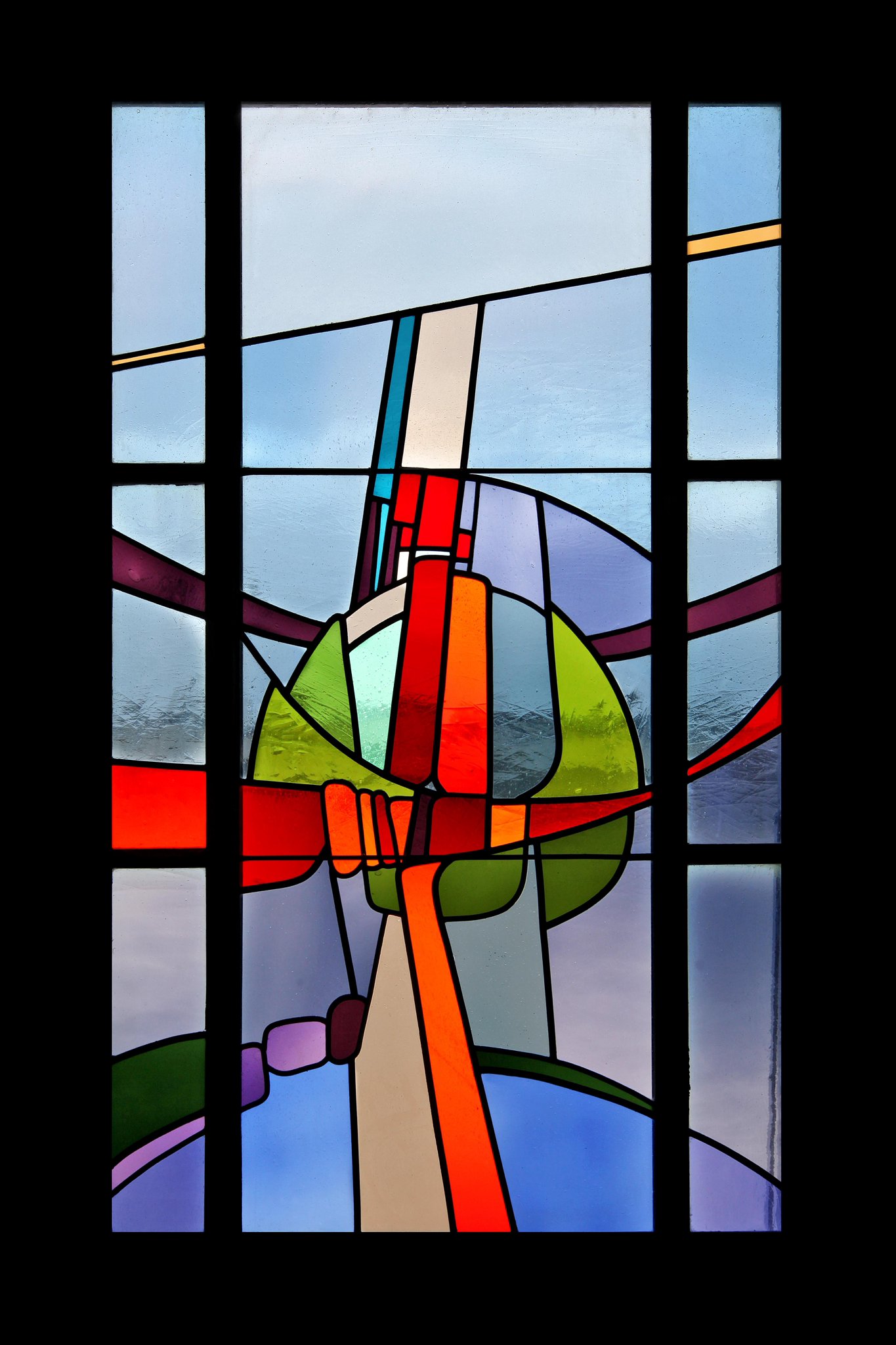 Le thème de la croix conjugué avec différentes formes et des teintes chaudes sur un fond bleuté.
