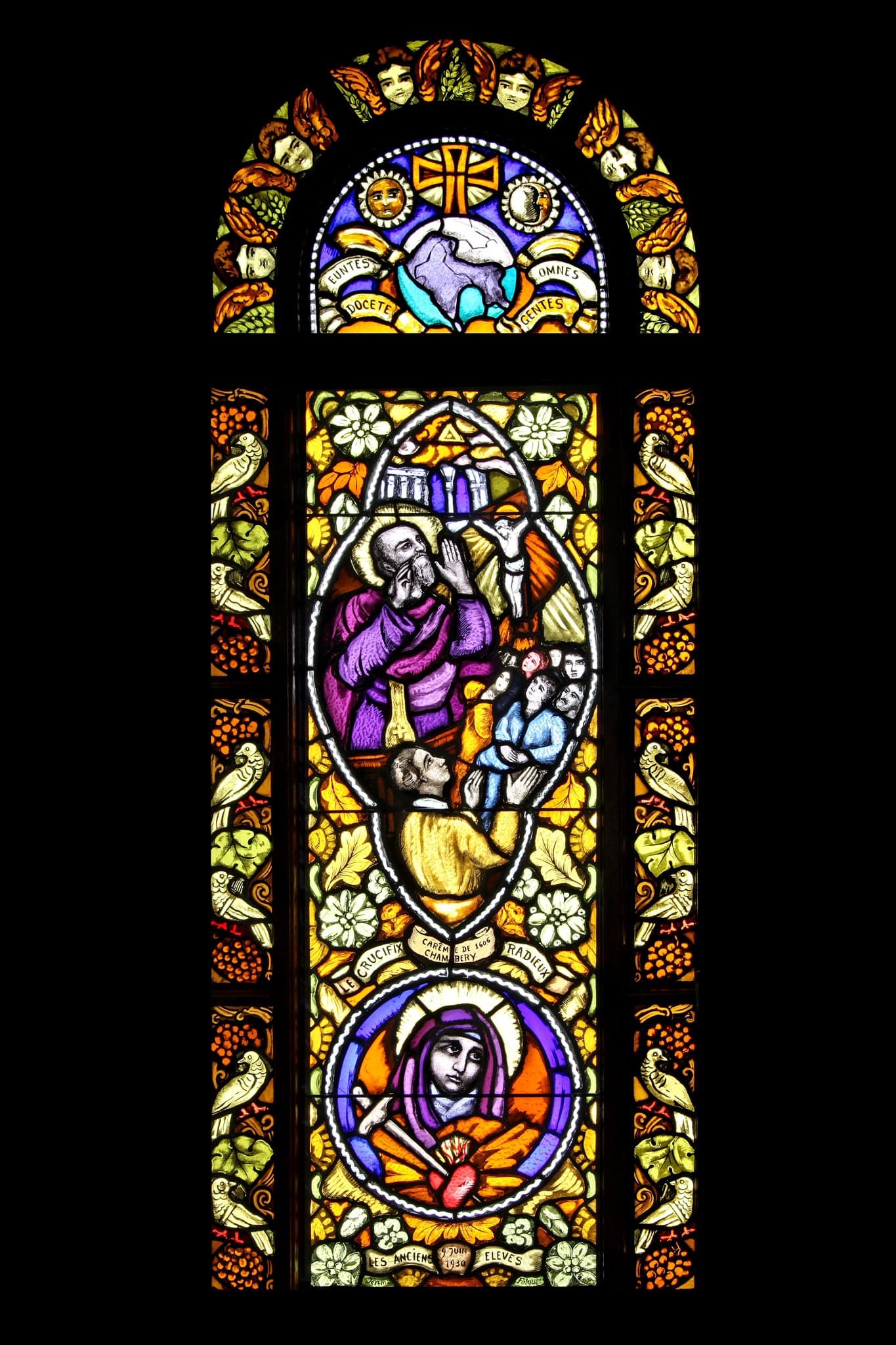 EUNTES / OMNES // DOCETE / GENTES (en haut) // LE CRUCIFIX // CARÊME DE 1606/ CHAMBERY // RADIEUX (banderole sous la scène centrale) // LES ANCIENS / 9 JUIN 1930 / ELEVES (banderole en bas)