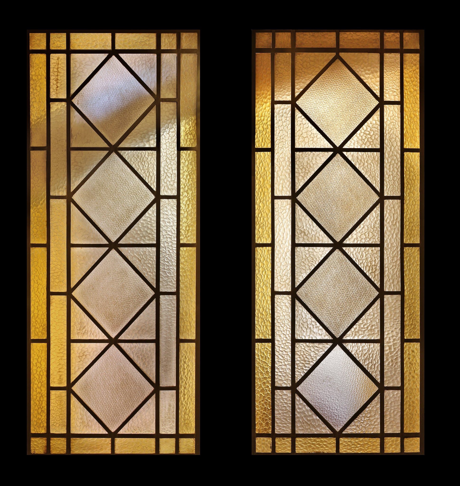 Un double vitrail en verre cathédrale et aux formes géométriques blanches avec une bordure jaune décore chaque palier de l’immeuble.