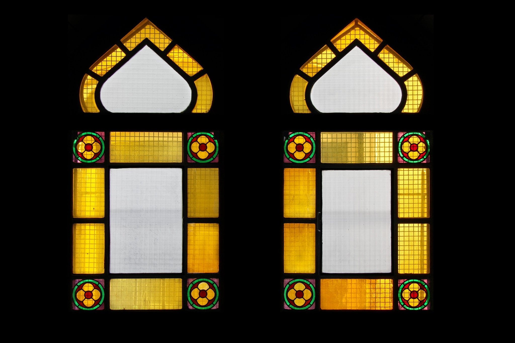 Deux vitraux jumelés ornementaux avec une bordure jaune décorée de fleurons dans les quatre angles.