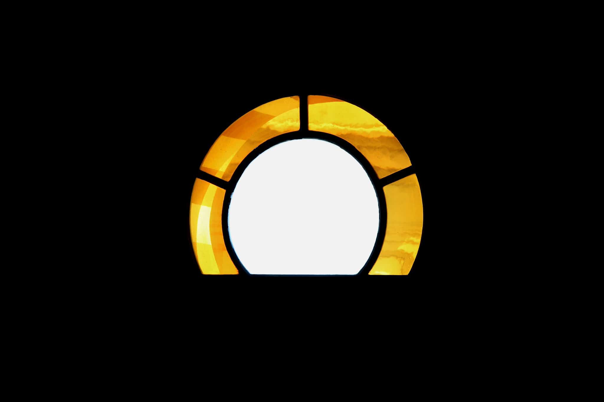 Au-dessus de la porte, une ouverture en arc outrepassé est décorée d’un vitrail avec du verre blanc et une bordure jaune.