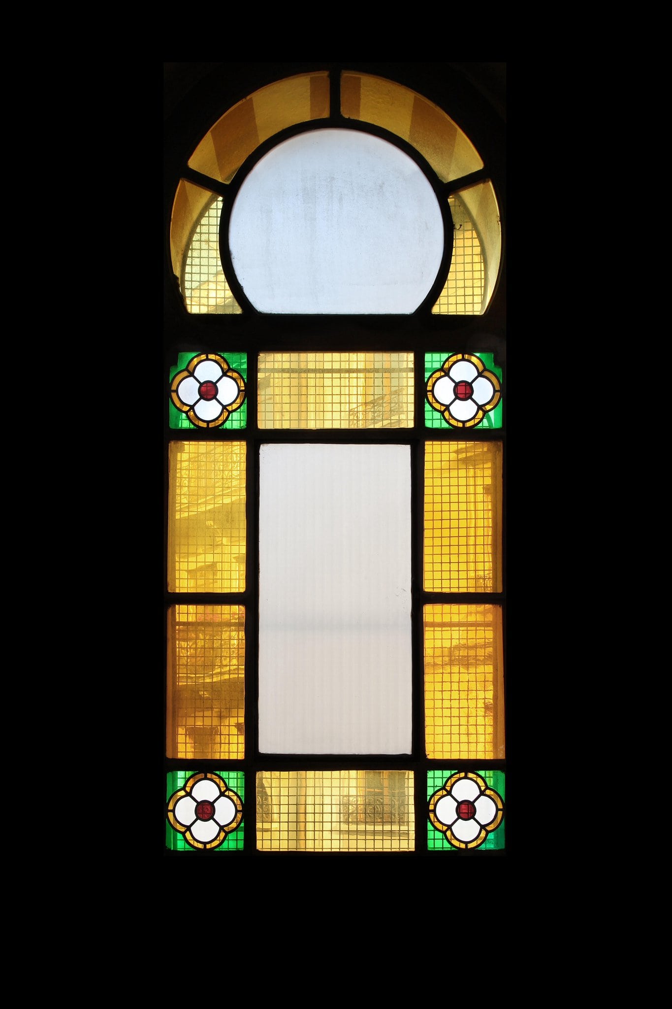 Un vitrail ornemental avec une bordure décorée de fleurons dans les quatre angles.
