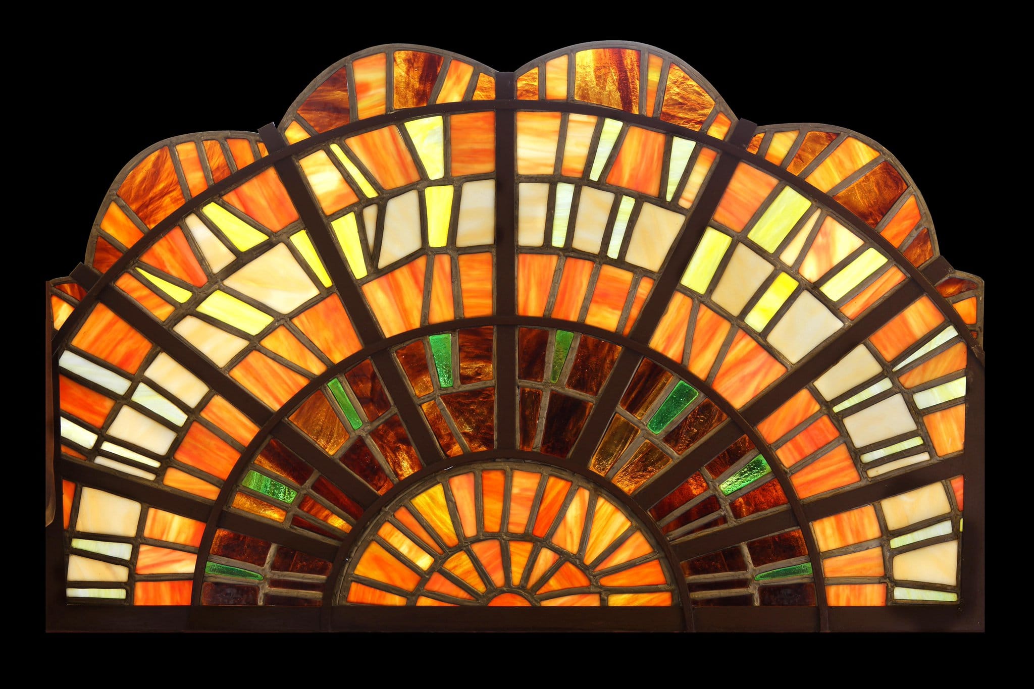Quatre éventails décoratifs en vitrail Tiffany et aux couleurs brunes, roses, jaunes et beiges sont répartis dans la salle à manger.