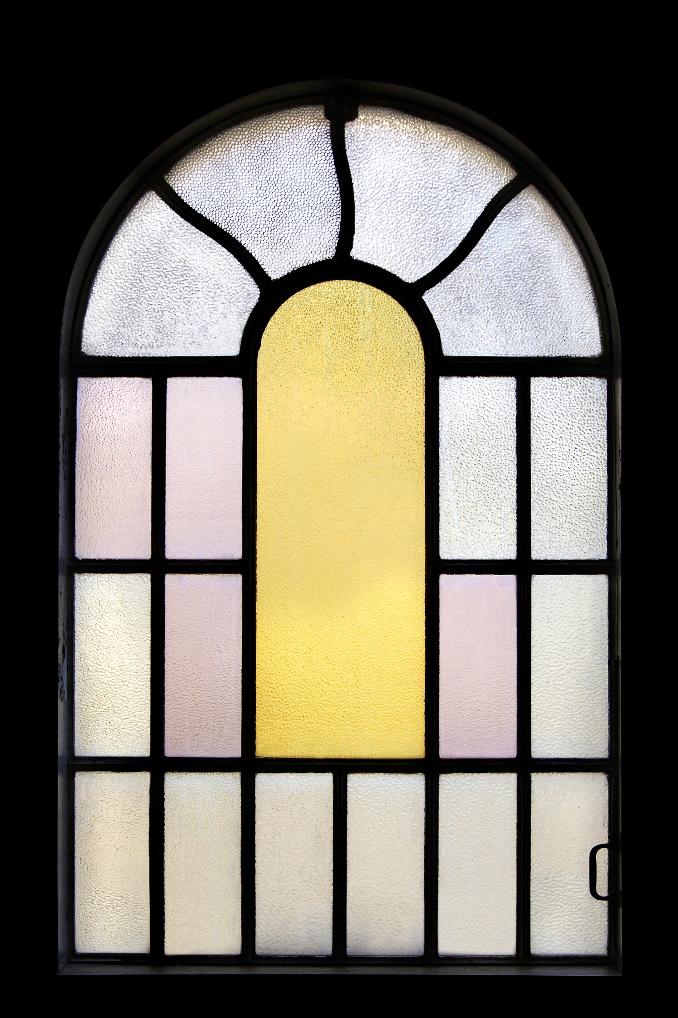 Une fenêtre composée de verre cathédrale avec au centre une lancette en plein cintre jaune. Trois verres roses entourent la lancette.