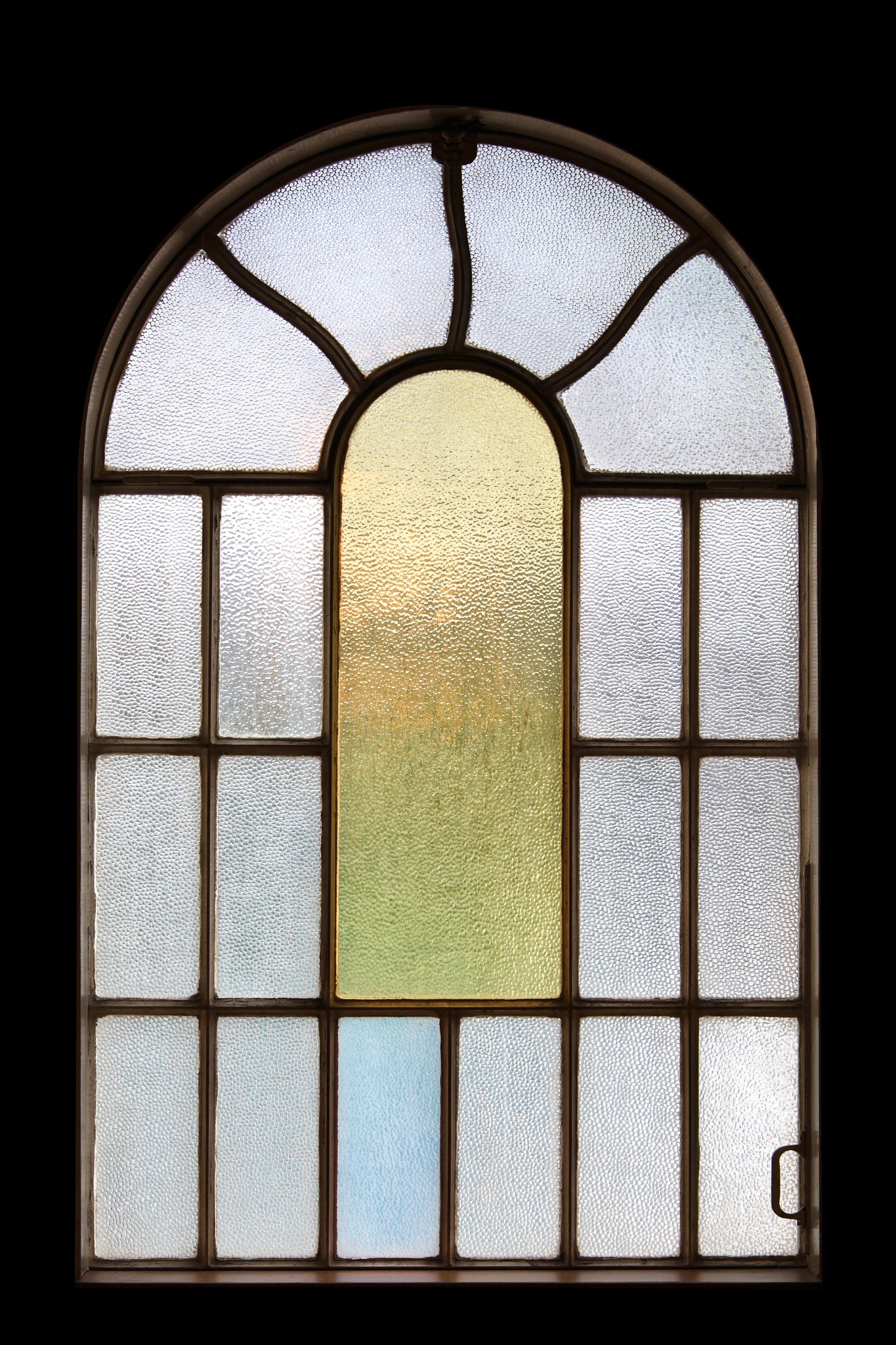 Une fenêtre composée de verre cathédrale avec au centre une lancette en plein cintre jaune.