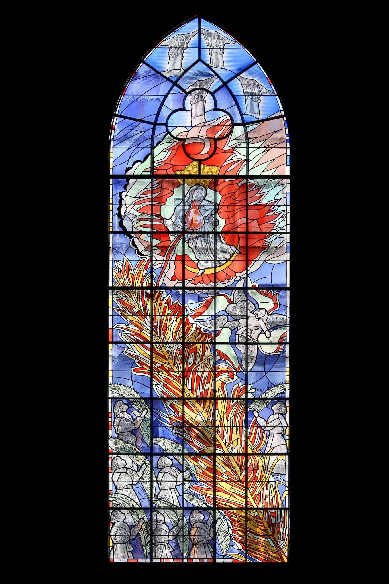 Une foule de gens vêtus d’habits blancs et tenant chacun une palme dans leurs mains regarde vers le haut en direction des quatre évangélistes. Au centre de huit ailes déployées, quatre têtes d’animaux pareilles à un lion, un humain, un taureau et un aigle, rendent gloire au Seigneur. Une femme debout sur un croissant de lune, vêtue de soleil, porte une couronne ornée de douze étoiles. Elle est en train d’enfanter dans la douleur. Quatre anges debout aux quatre coins de la terre tiennent les quatre vents de la terre (lecture de bas en haut). Une grande palme du martyr se déploie sur une bonne partie du vitrail.