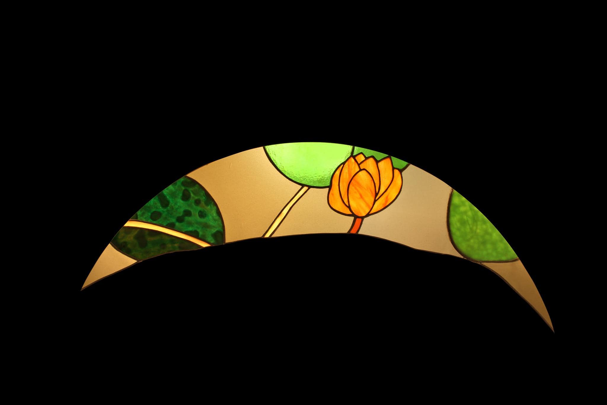 Un nénuphar en vitrail Tiffany se déploie au centre dans un arc de cercle.