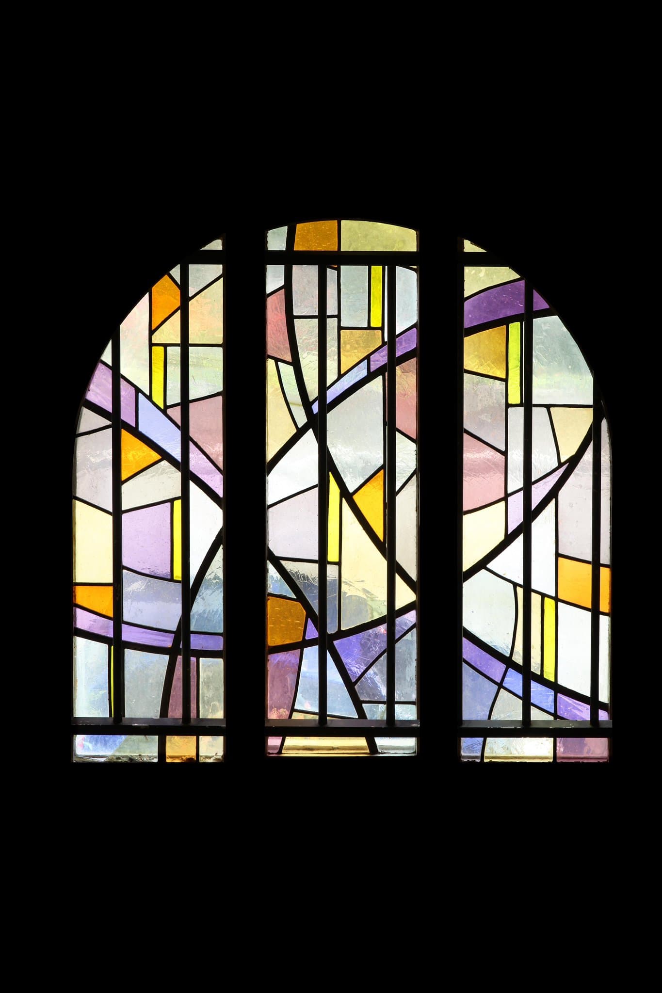 Vitrail abstrait composé de courbes et de lignes avec des verres jaunes, mauves, roses et blancs.
