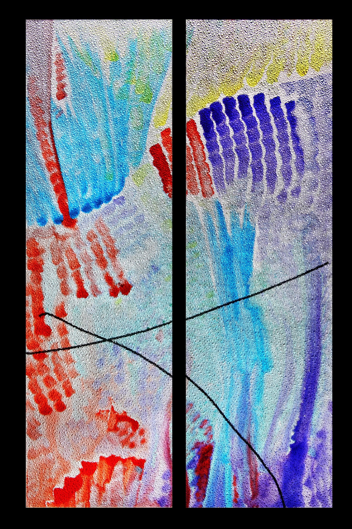 Deux panneaux indépendants composés de motifs abstraits dans des teintes à dominante bleue, violette et rouge sont posés sur les vantaux intérieurs d’une fenêtre.